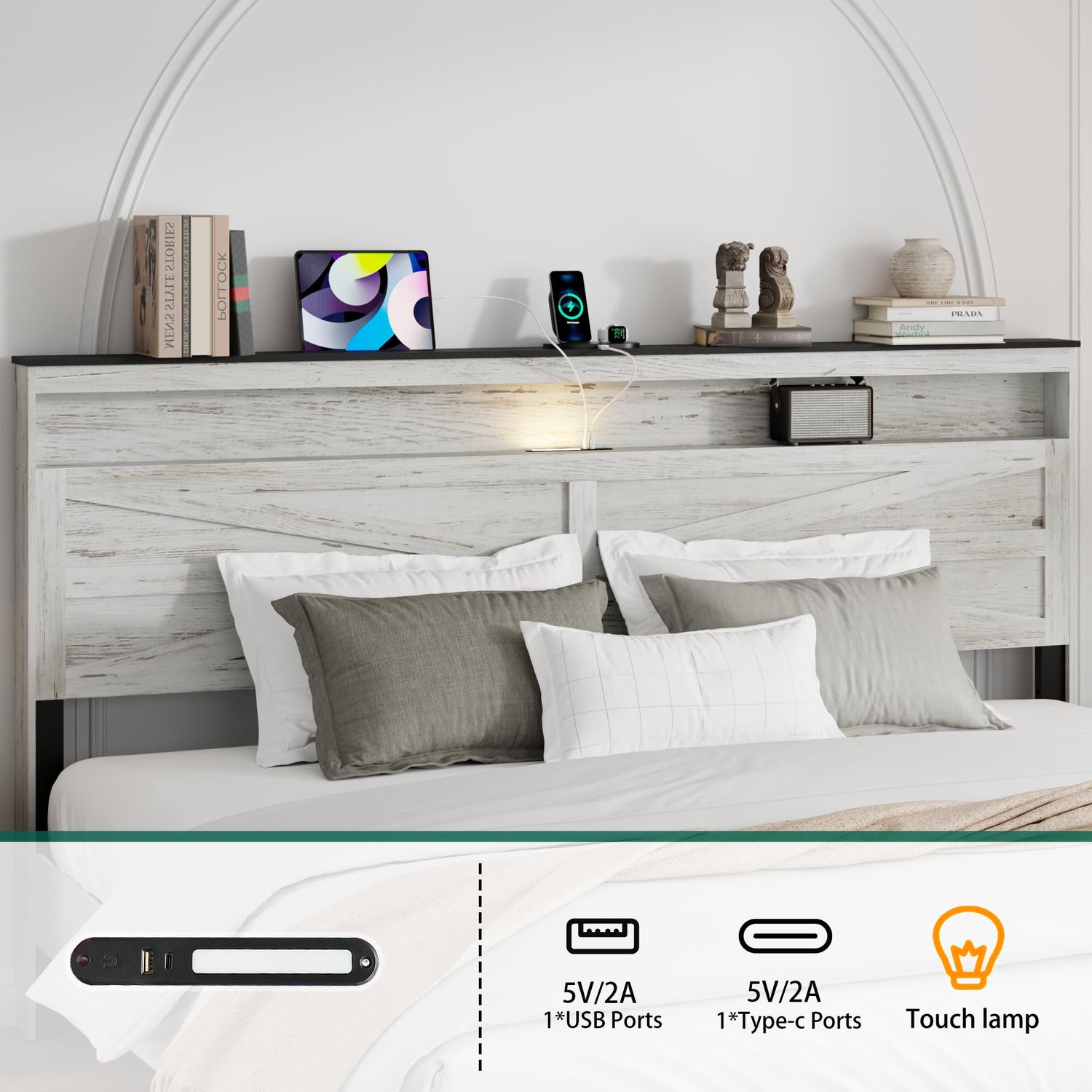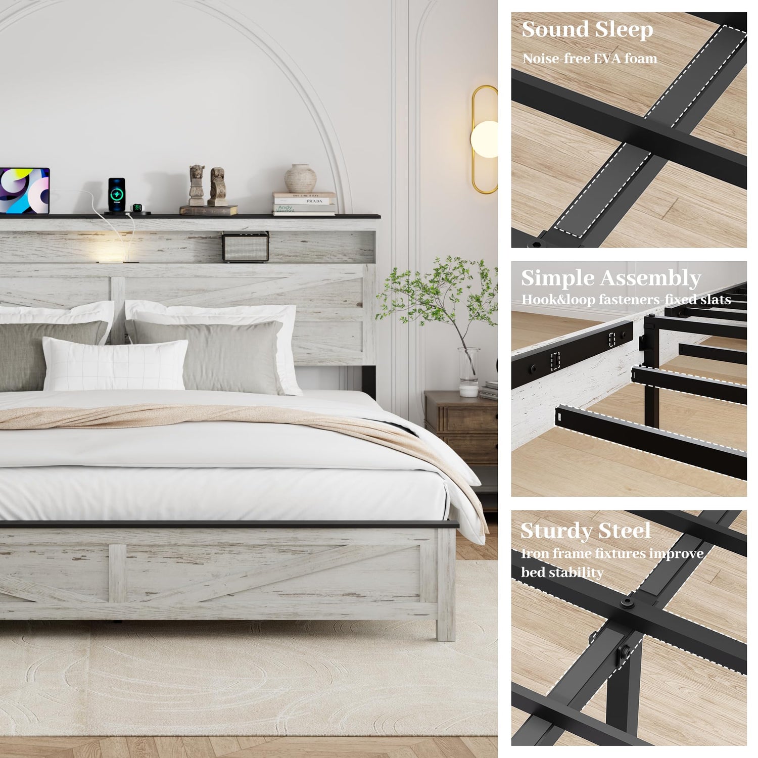 PAUKIN King Size Bed Frame with Headboard, Rustic Farmhouse Wood Bed Frame with LED Lights and Charging Station, Easy Assembly, No Box Spring Needed (White, King)