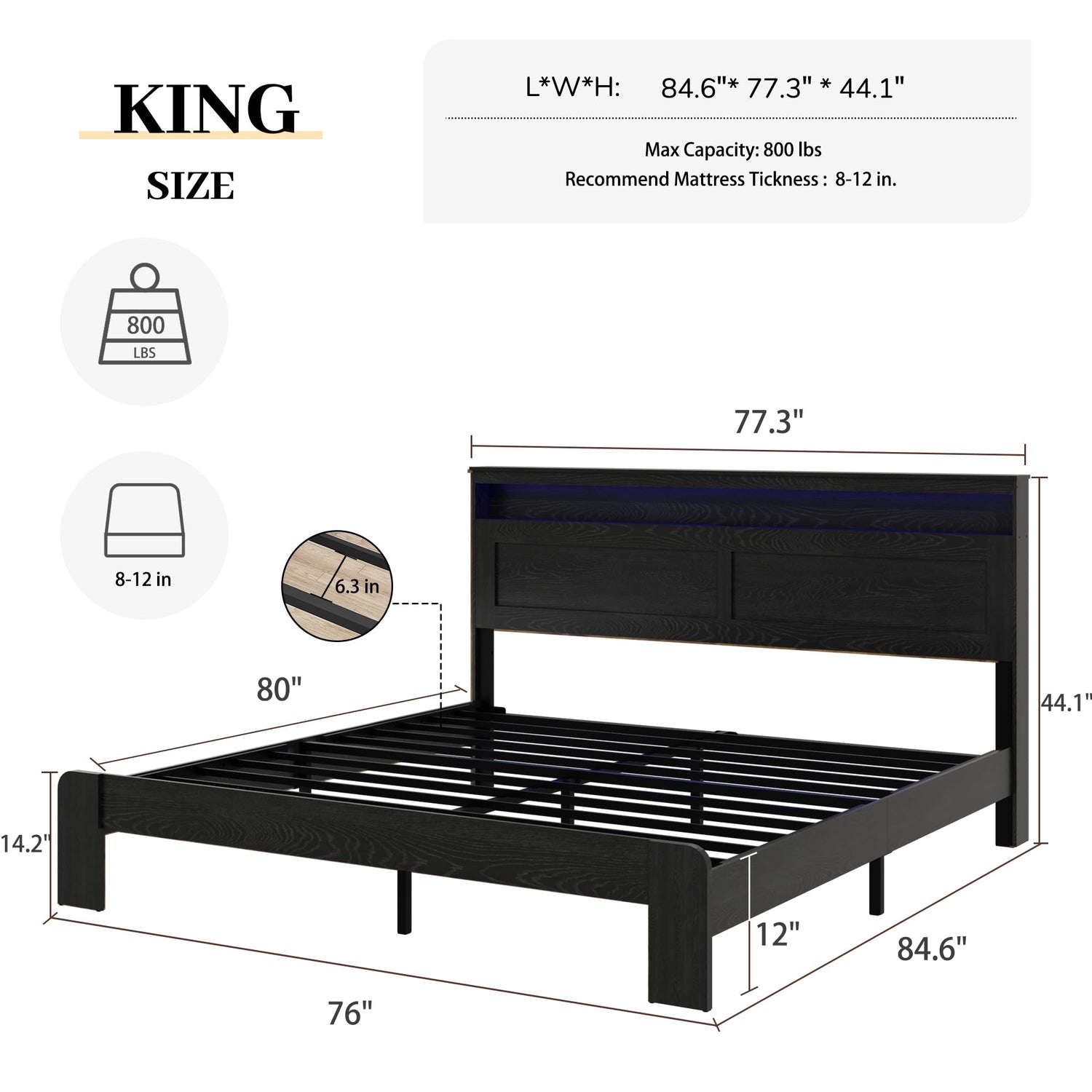 PAUKIN King Size Wooden Bed Frame with Headboard, Rustic Farmhouse Wooden Bedframe with LED Lights and Charging Station, Easy Assembly, No Box Spring Needed (Black, King)