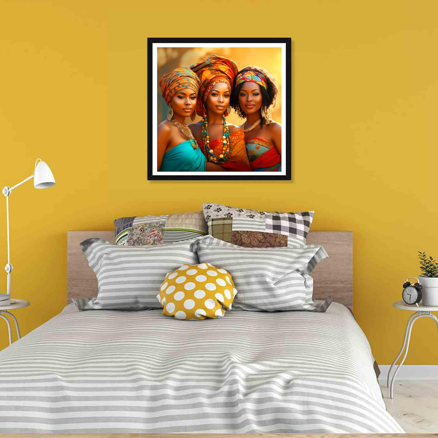 - Beautiful Diamond Art: Three women stand together, adorned in vibrant headwraps and traditional jewelry. Their attire is a rich tapestry of colors and patterns, reflecting a deep cultural heritage. The warm glow of the setting sun enhances their connection, symbolizing unity and strength. This image captures the essence of sisterhood and resilience, ready to be transformed into a diamond painting that celebrates their spirit.