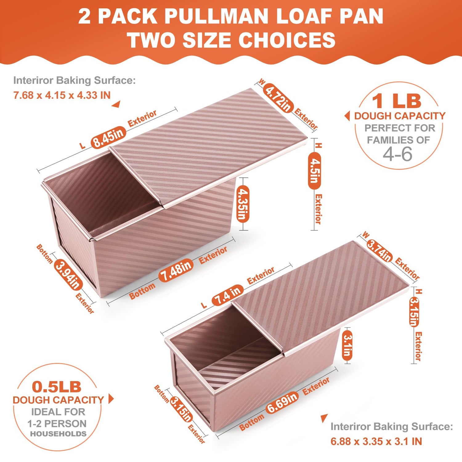 - 【TWO SIZES FOR EVERY OCCASIONS】This value set includes two pullman loaf pan. The large bread pan with lid measures 8.45 x 4.72 x 4.5 inches and has a 1lb dough capacity, perfect for families of 4-6. The mini sandwich bread pan measures 7.4 x 3.74 x 3.15 inches with a 0.5lb dough capacity, ideal for 1-2 person households. It makes a thoughtful present for baking enthusiasts on various occasions, from birthdays to holidays. (NOTE: PLS CHECK THE DETAIL SIZE BEFORE PURCHASE)