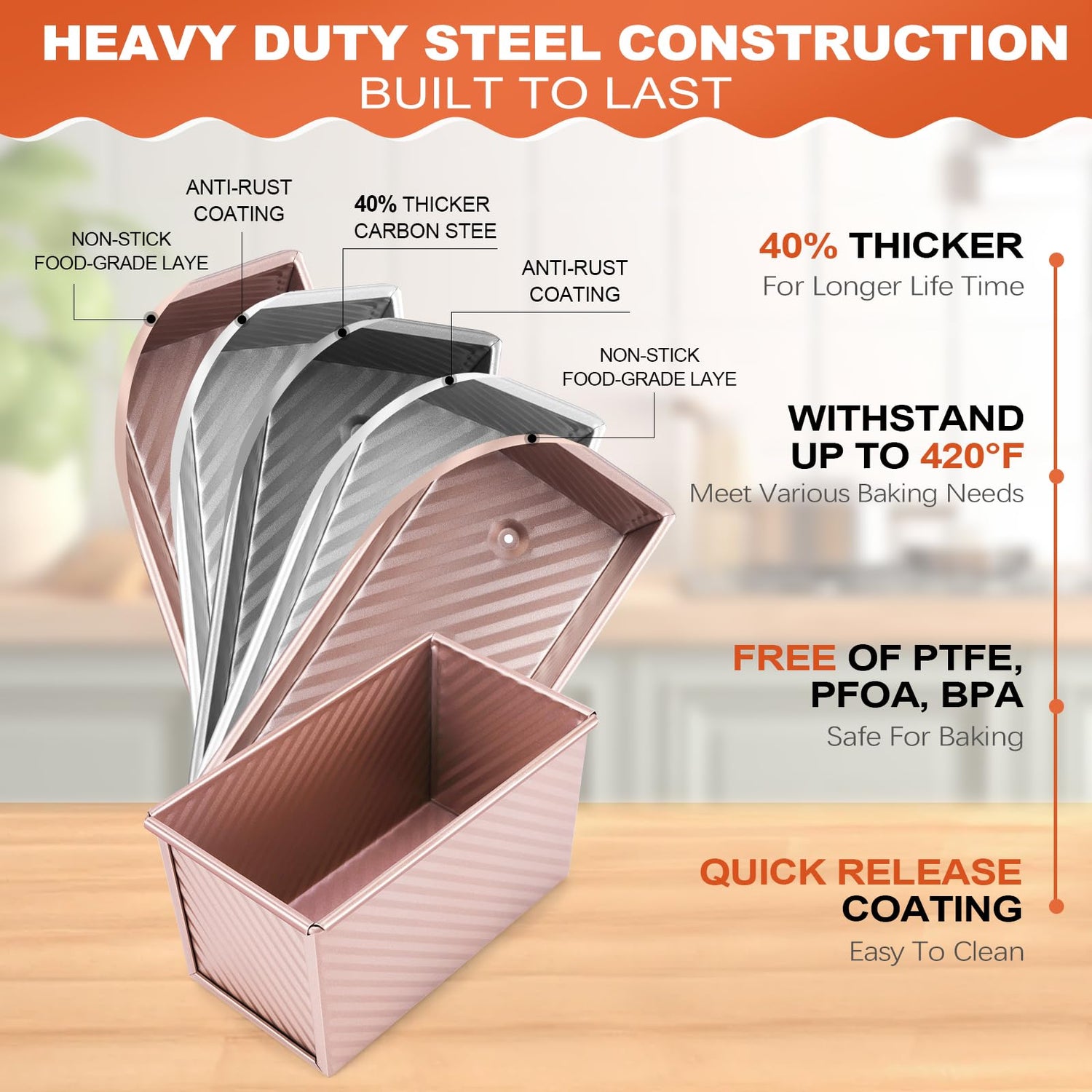 - 【BUILT TO LAST】The pullman milk bread pan boast heavy-gauge steel construction. With three layers of quality - 40% thicker carbon steel for added strength, an anti-rust coating, and a non-stick quick-release layer - these japanese bread pan are designed to last. They conduct heat quickly and evenly, capable of withstanding temperatures up to 420°F.