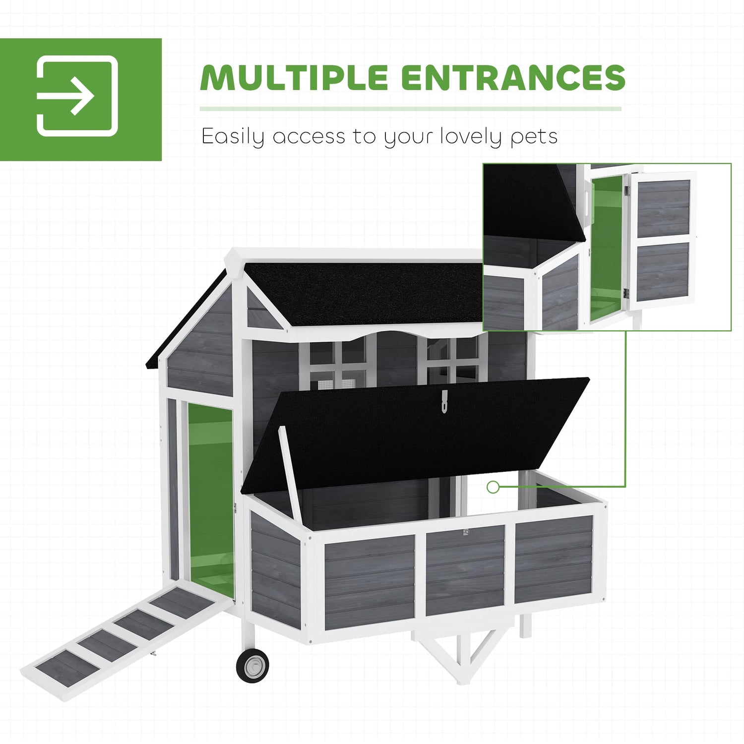 - Functional design: Features include two easy-access doors (one doubles as a ramp), a pull-out tray for cleaning, and clear windows for viewing the chickens