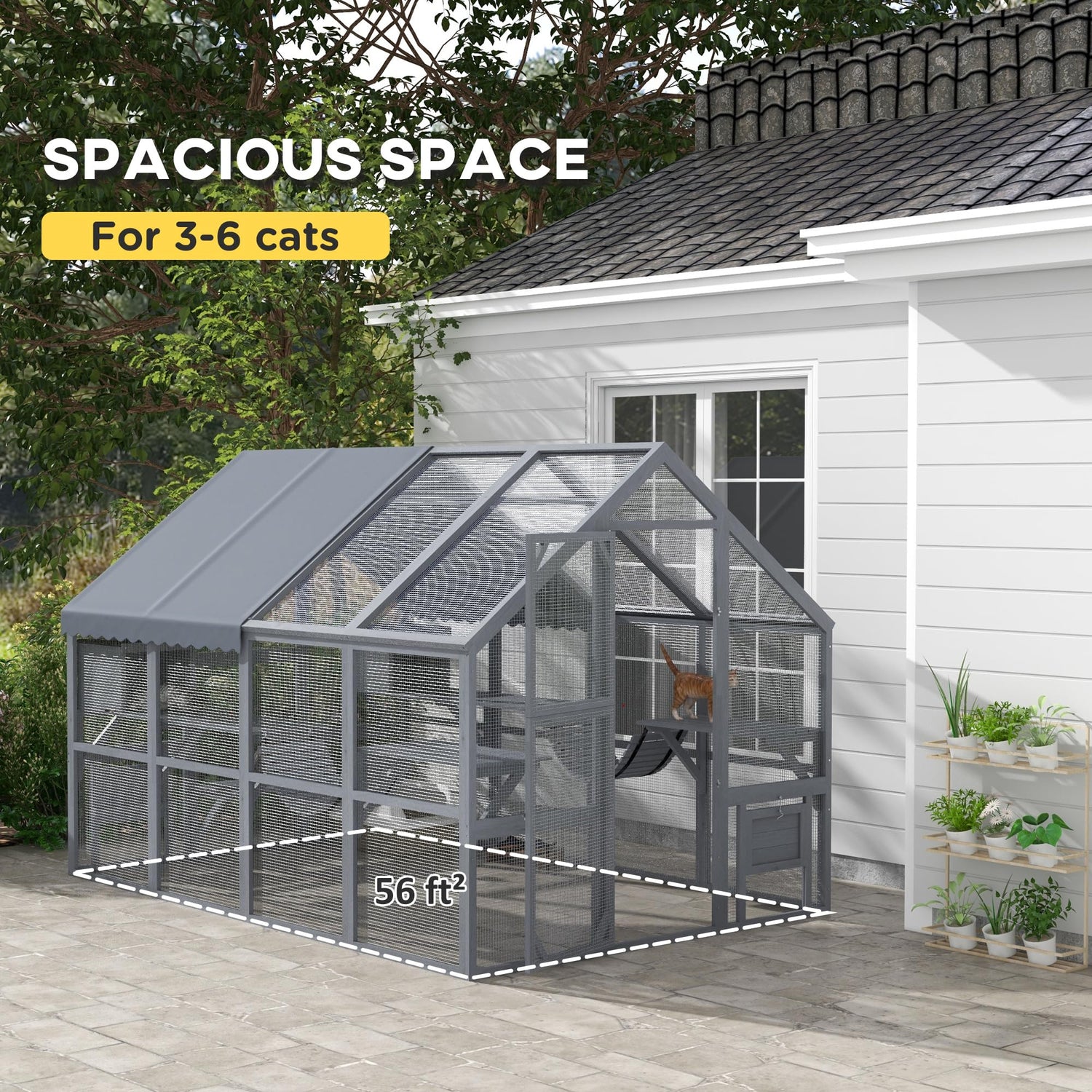 - Roomy Cat Haven: Boasting 56 ft² of interior space, this outdoor cat enclosure comfortably houses 3-6 cats, each up to 16 lbs. It is designed to indulge your cats with their favorite things—ample heights, cozy hiding spots, and sunlight lounging.