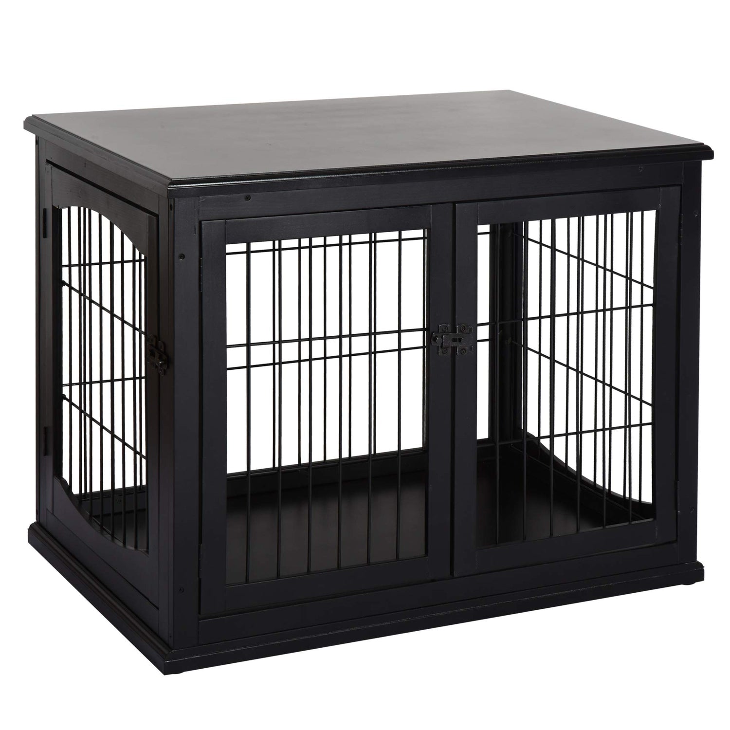 - Double Entrances: The two-way entry makes it easy to let the dog out, allowing you to unlatch the door in a quick moment, reaching from any angle while sitting on the couch or in a chair. With French doors on the side, the doors of this wood dog crate treat your furry friend with style.