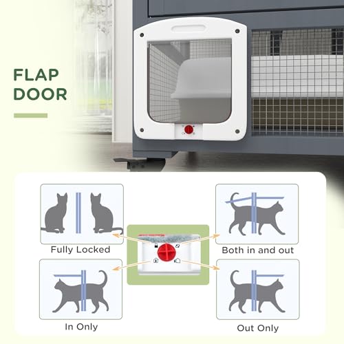 - Convenient Access: This cat patio offers a large entrance for quickly adding a litter box. Dual front and middle doors facilitate effortless cleaning. The versatile flap door includes four lock settings: exit only, entry only, both directions, or fully locked for optimal control.