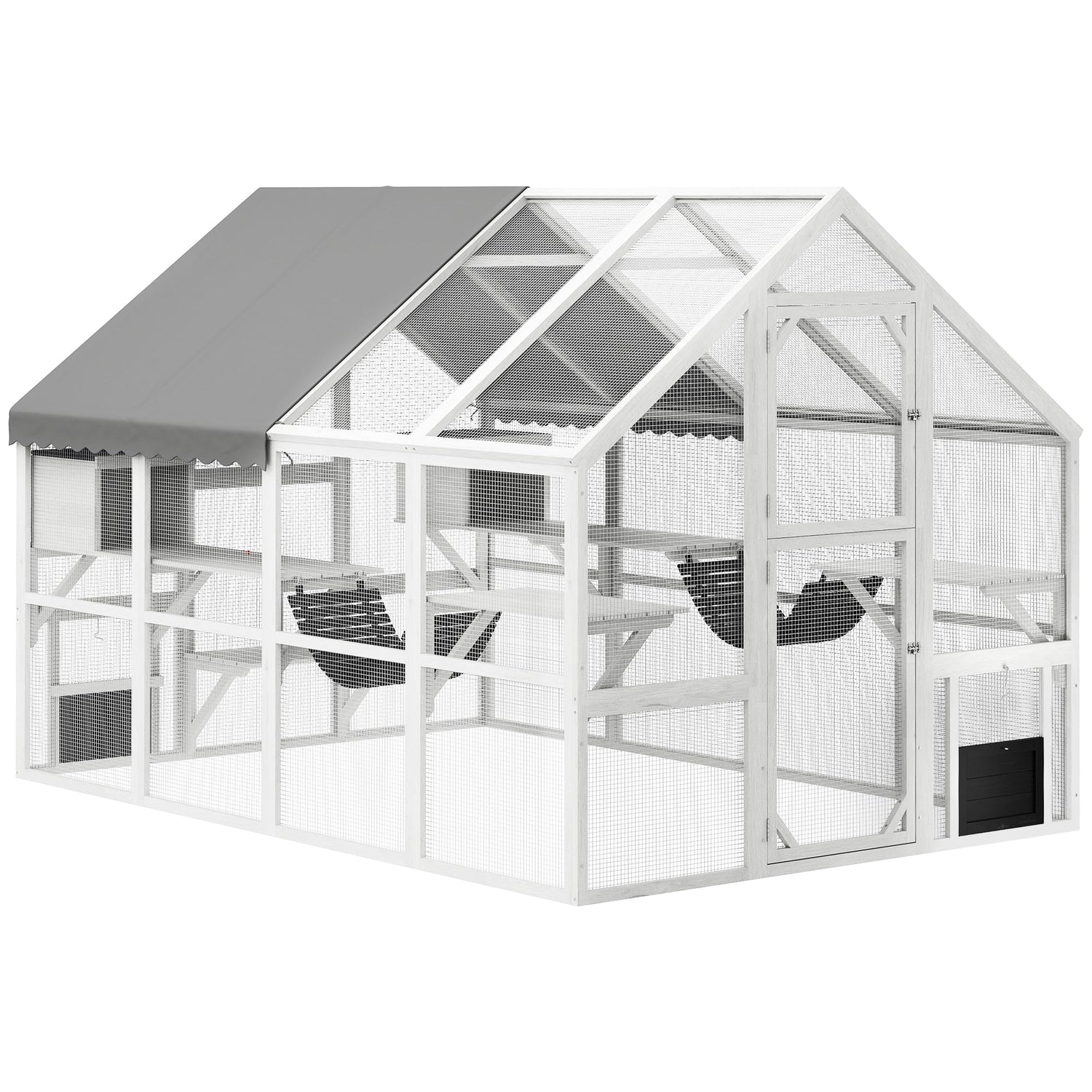 PawHut Large Catio Outdoor Cat Enclosure for Multiple Kittens, Wooden Cat House with Waterproof Cover, Walk in Kitty Cage Kennel with 2 Condos, 6 Platforms, Bridge, Doors, 110" x 73" x 74", White