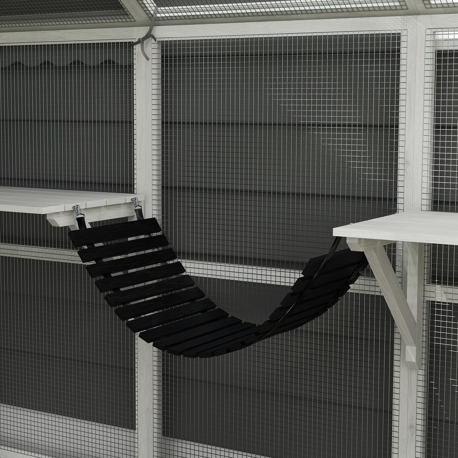 - Whisker-Twitching Adventures: This spacious cat patio comfortably fits 3 to 6 cats, featuring two cozy condos with curtains, six elevated platforms, and two soft climbing ladders for endless pouncing, lounging, and sunbathing.