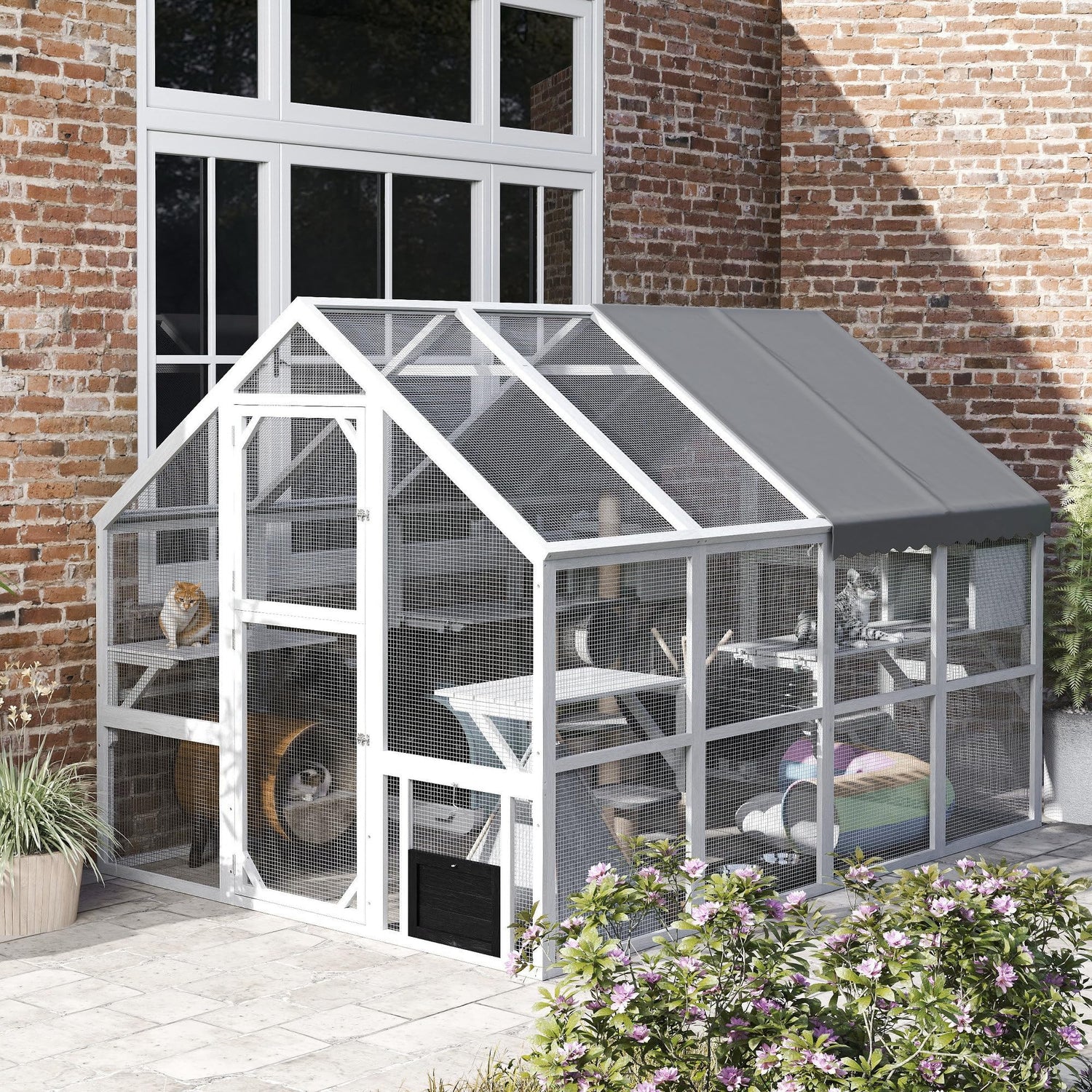 - Fit Any Weather: Crafted with fir wood and finished with a waterproof, pet-safe coating, this outdoor cat enclosure is designed to withstand the elements. The 420D waterproof, anti-UV cover keeps your cats cozy and dry, rain or shine.