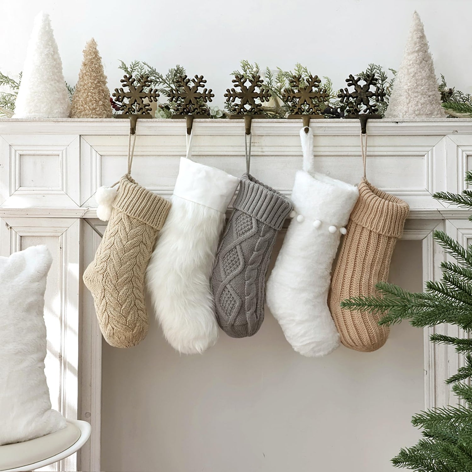 Pawliss Christmas Stockings: 5 Pack Farmhouse Plush Faux Fur & Cable Knitted Fireplace Xmas Stockings, Hanging Gifts Cozy Personalized Stocking Decorations for Family Holiday Décor, White Gray Beige