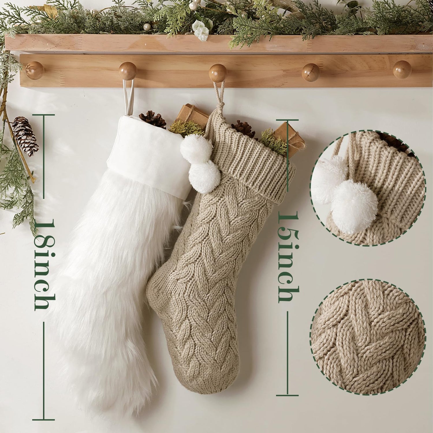 - VALUE PACK: 2 packs of 18 inches premium plush Xmas stockings and 3 packs of 15 inches handmade cable knitted Christmas stockings with white, gray and beige. 5 different rustic patterns add clean natural tones to your Christmas party decor. A great addition to holiday decorations and seasonal decor.