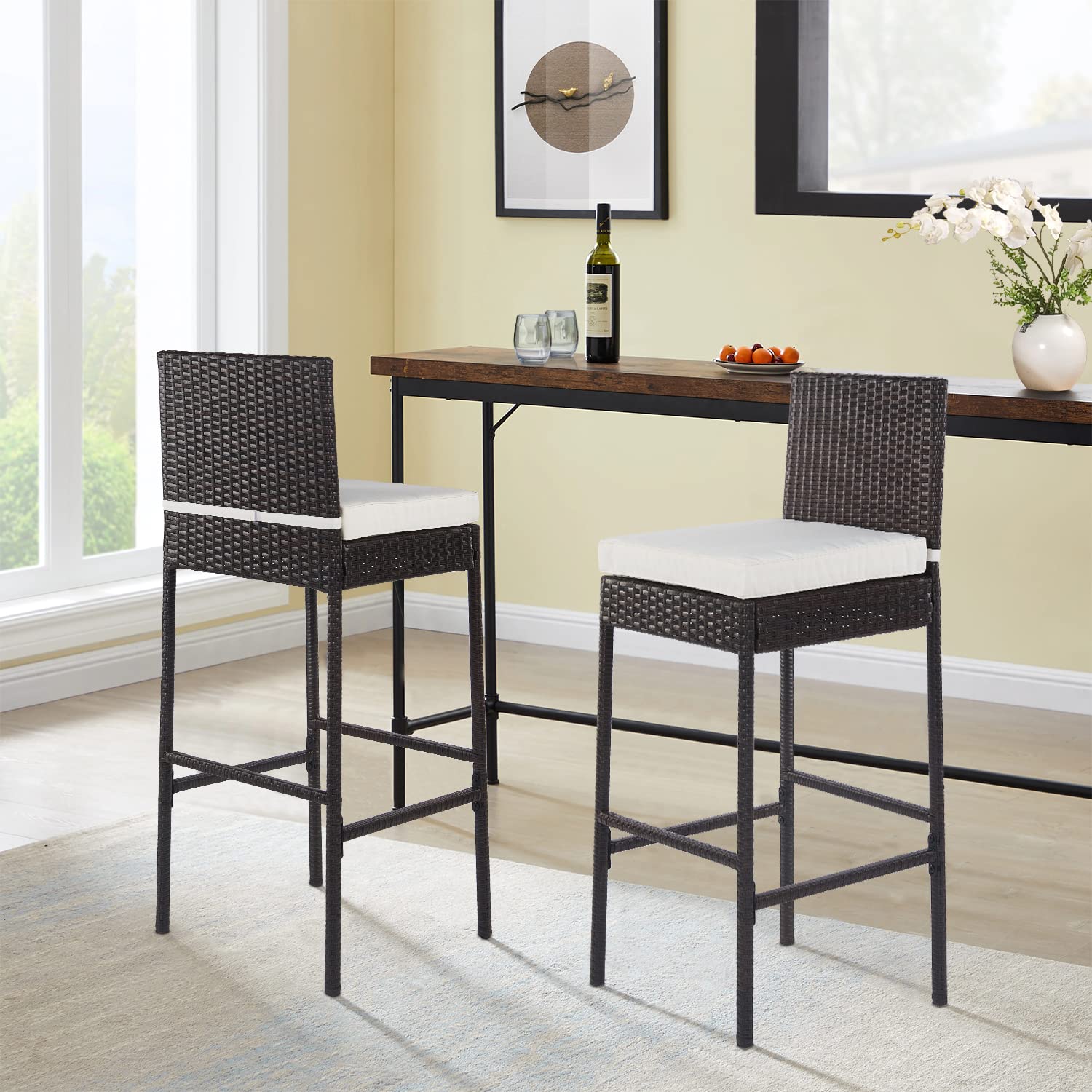 PayLessHere 2 Piece Outdoor Bar Stools 30" Wicker Patio Stools Bar Chairs Height Stools All Weather Patio Furniture with Footrest Khaki Cushion for Outdoor Indoor Pool Lawn Porch Backyard,Brown