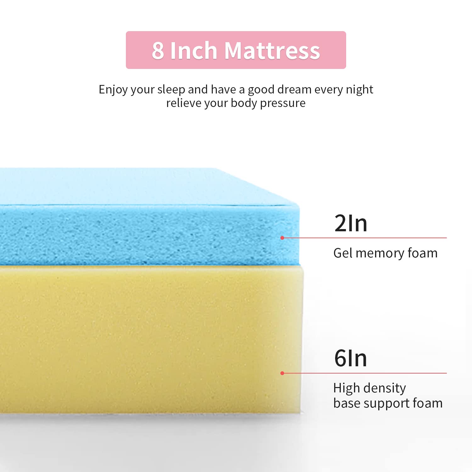 - Layering: 8 inch mattress, 2 layers full foam system, mattress layer details: 6 "base support foam +2" gel memory foam. Foam mattresses are not too soft or strong for all sleeping positions. This medium firmness mattress is made of gel memory foam combined with comfy foam for the perfect top layer to support your weight and maintain your body shape for optimal rest.