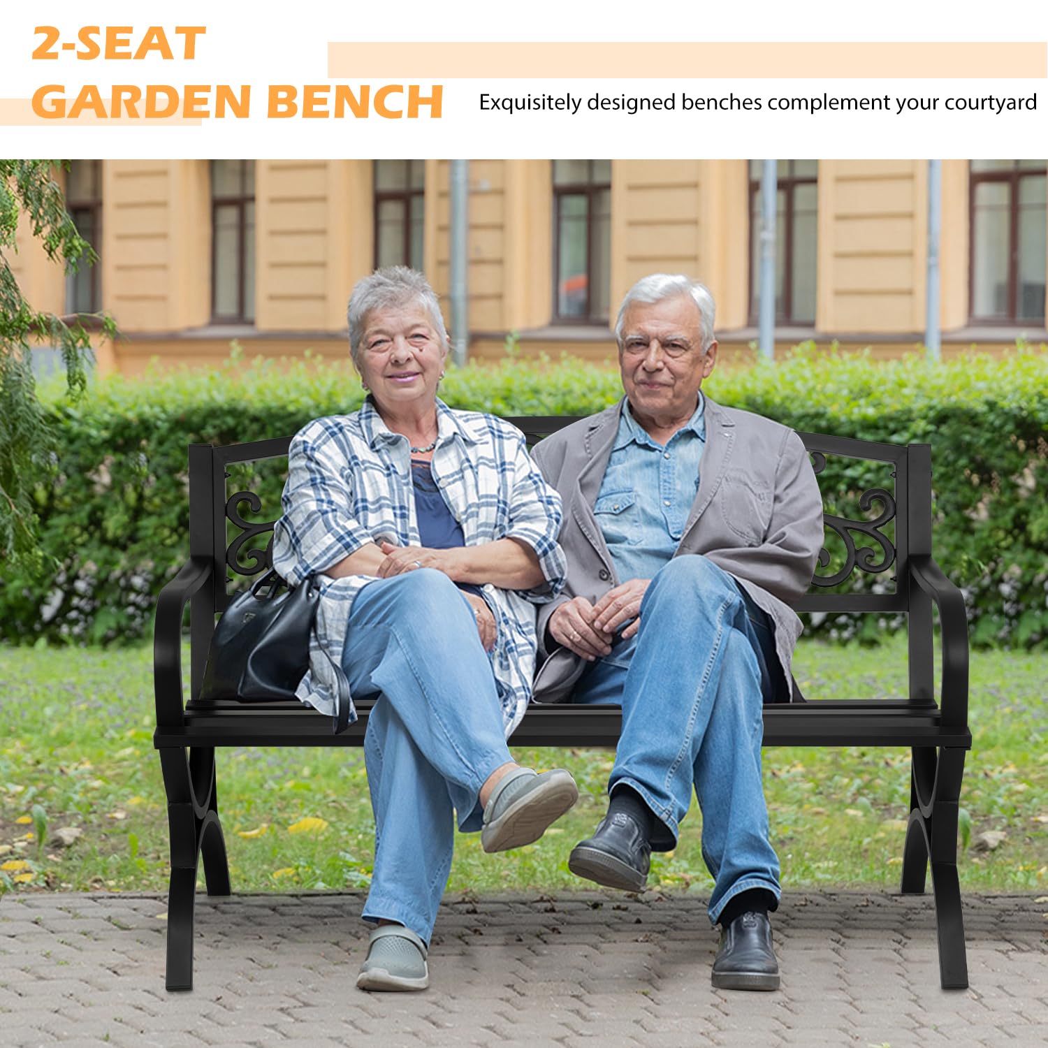 PayLessHere Black Outdoor Metal Loveseat Chairs Patio Garden Bench 50-inch Slatted Seat Armrests Floral Design Plastics Backres Perfect for Park, Yard, Porch, Lawn, Balcony, Backyard