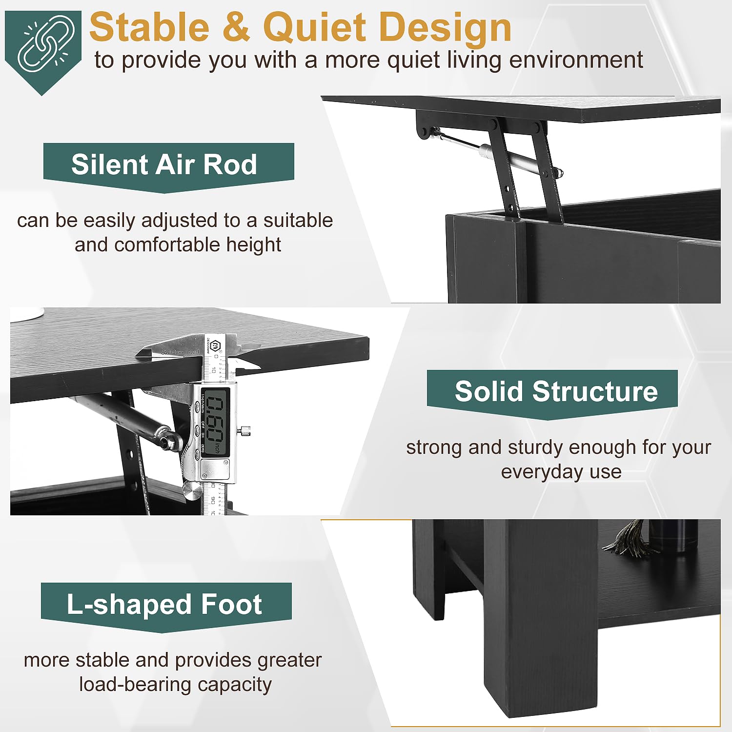 - 1.**Hidden Compartment and Storage Shelf:** Discover a concealed storage compartment within the lift coffee tabletop, ideal for storing remotes, magazines, and more. The additional lower storage shelf of our coffee tables provides extra space for keeping your living area organized. This dual-storage feature maximizes functionality while maintaining the lift top coffee table's sleek and clutter-free appearance.
