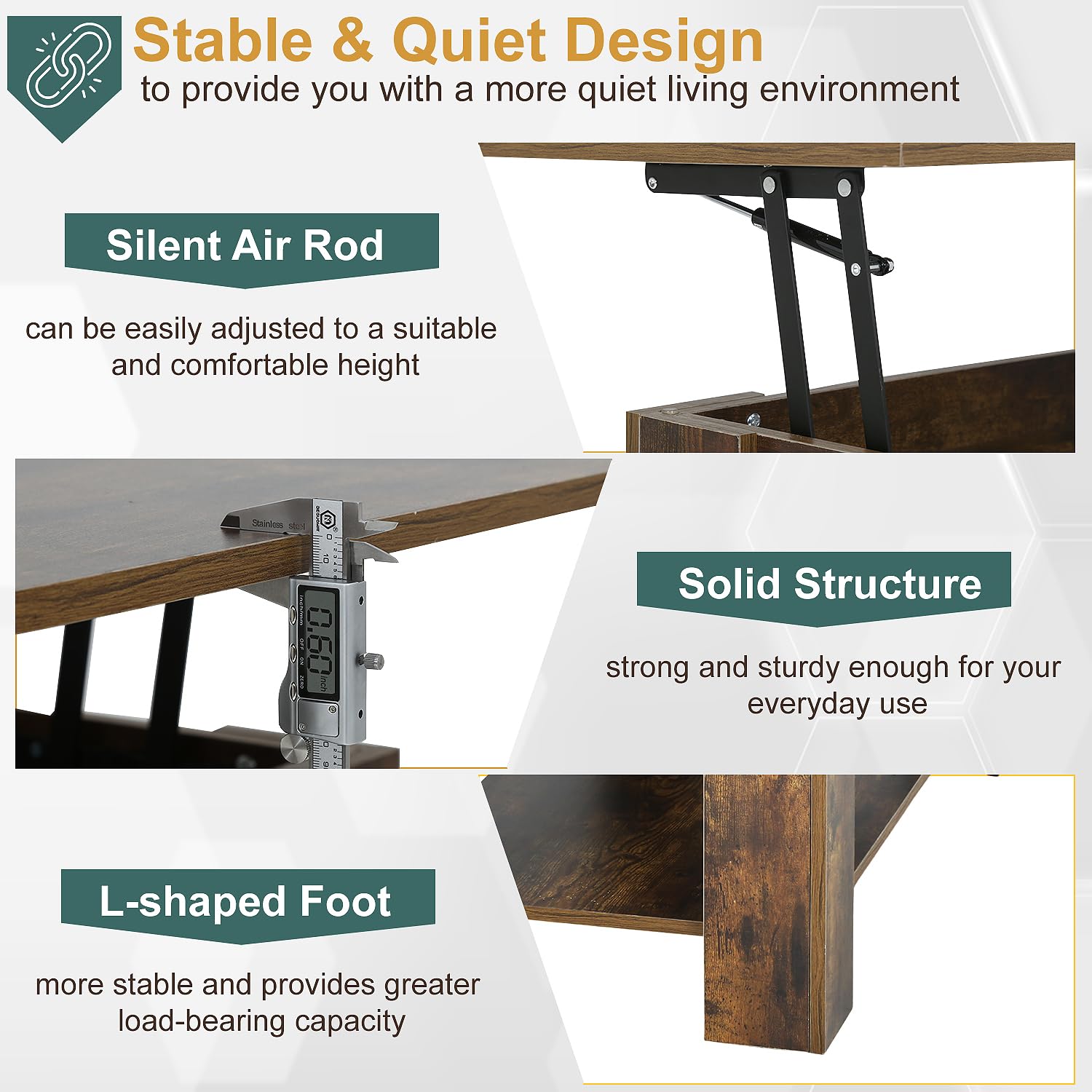- 4.**Soft-Close/Open Mechanism:** The soft-close/open mechanism of our coffee table provides a gentle and quiet operation when accessing the hidden compartment. Enjoy the convenience of this lift top coffee table’s feature without abrupt movements or noise disruptions. Elevate your living space with a coffee table that embodies both form and function.