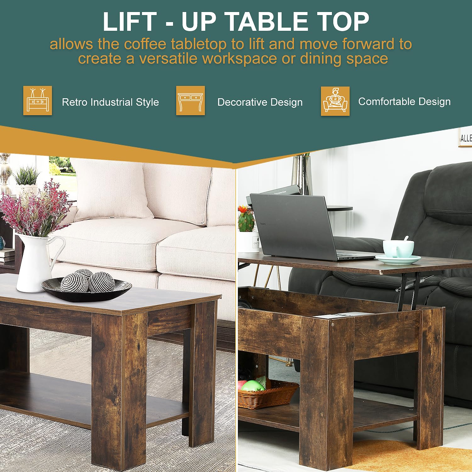 - 1.**Hidden Compartment and Storage Shelf:** Discover a concealed storage compartment within the lift coffee tabletop, ideal for storing remotes, magazines, and more. The additional lower storage shelf of our coffee tables provides extra space for keeping your living area organized. This dual-storage feature maximizes functionality while maintaining the lift top coffee table's sleek and clutter-free appearance.