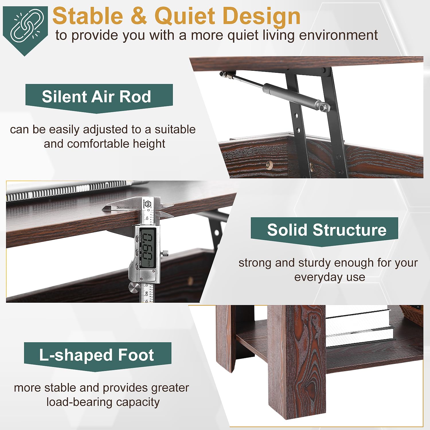 - 4.**Soft-Close/Open Mechanism:** The soft-close/open mechanism of our coffee table provides a gentle and quiet operation when accessing the hidden compartment. Enjoy the convenience of this lift top coffee table’s feature without abrupt movements or noise disruptions. Elevate your living space with a coffee table that embodies both form and function.