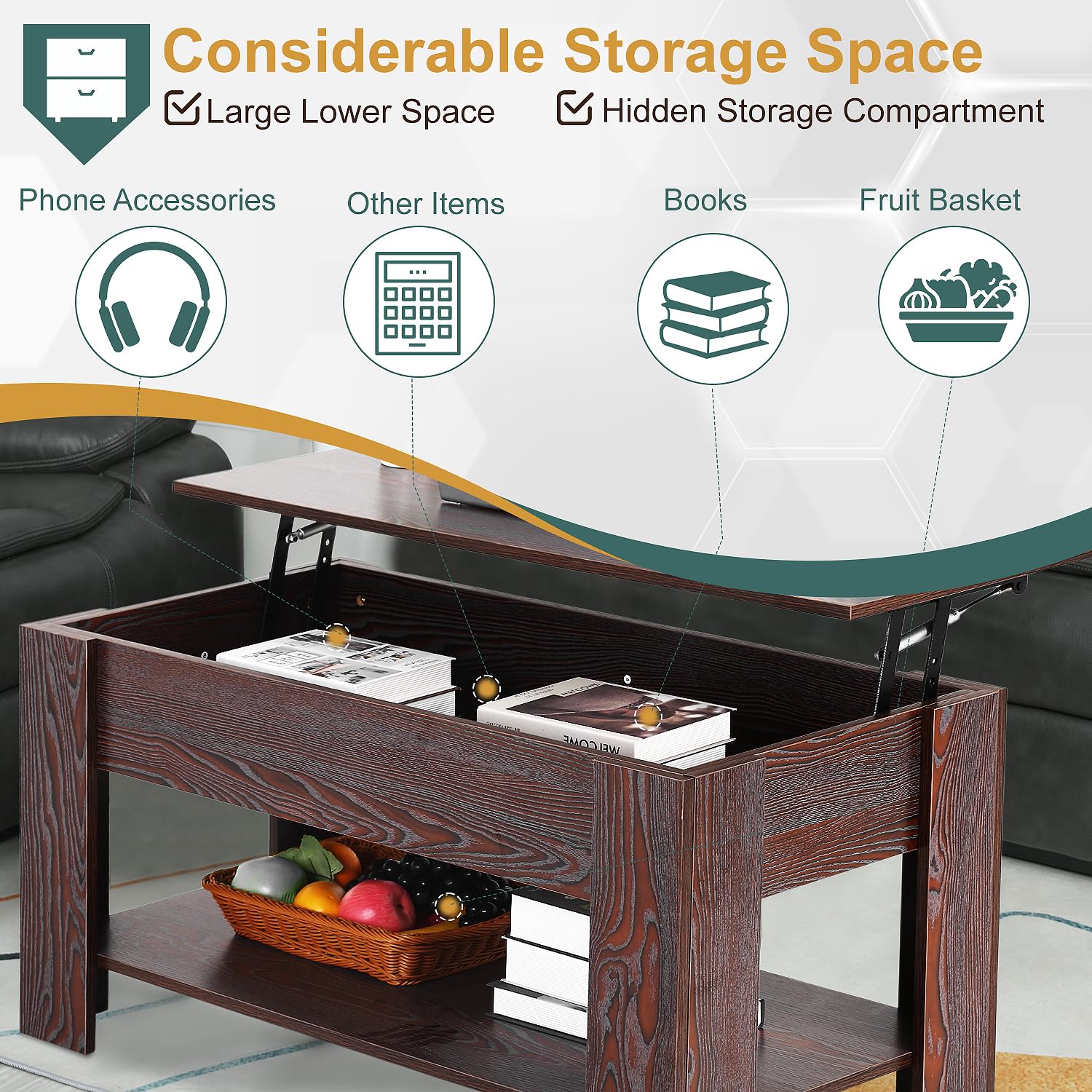 - 1.**Hidden Compartment and Storage Shelf:** Discover a concealed storage compartment within the lift coffee tabletop, ideal for storing remotes, magazines, and more. The additional lower storage shelf of our coffee tables provides extra space for keeping your living area organized. This dual-storage feature maximizes functionality while maintaining the lift top coffee table's sleek and clutter-free appearance.
