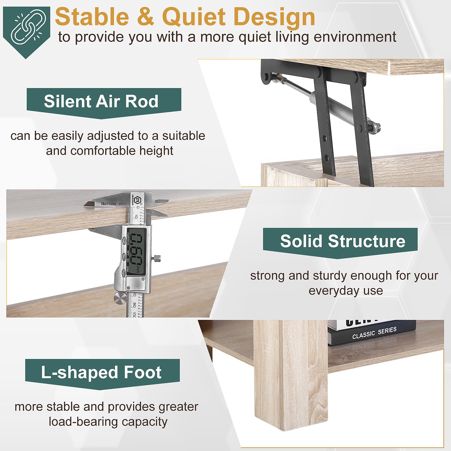 - 4.**Soft-Close/Open Mechanism:** The soft-close/open mechanism of our coffee table provides a gentle and quiet operation when accessing the hidden compartment. Enjoy the convenience of this lift top coffee table’s feature without abrupt movements or noise disruptions. Elevate your living space with a coffee table that embodies both form and function.