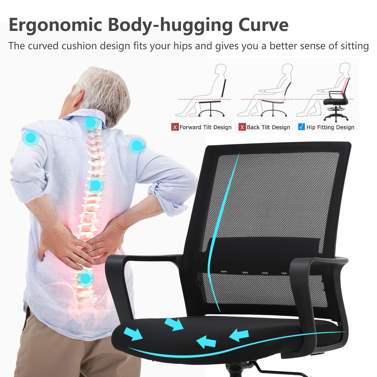 - Enhanced Ergonomics: Experience the ergonomic benefits of our office desk chair. The curved design of the mesh chair reduces back tension, promoting exceptional comfort during extended periods of use. With an ergonomic backrest providing reliable lumbar support, this chair ensures you maintain the proper posture for prolonged work sessions.
