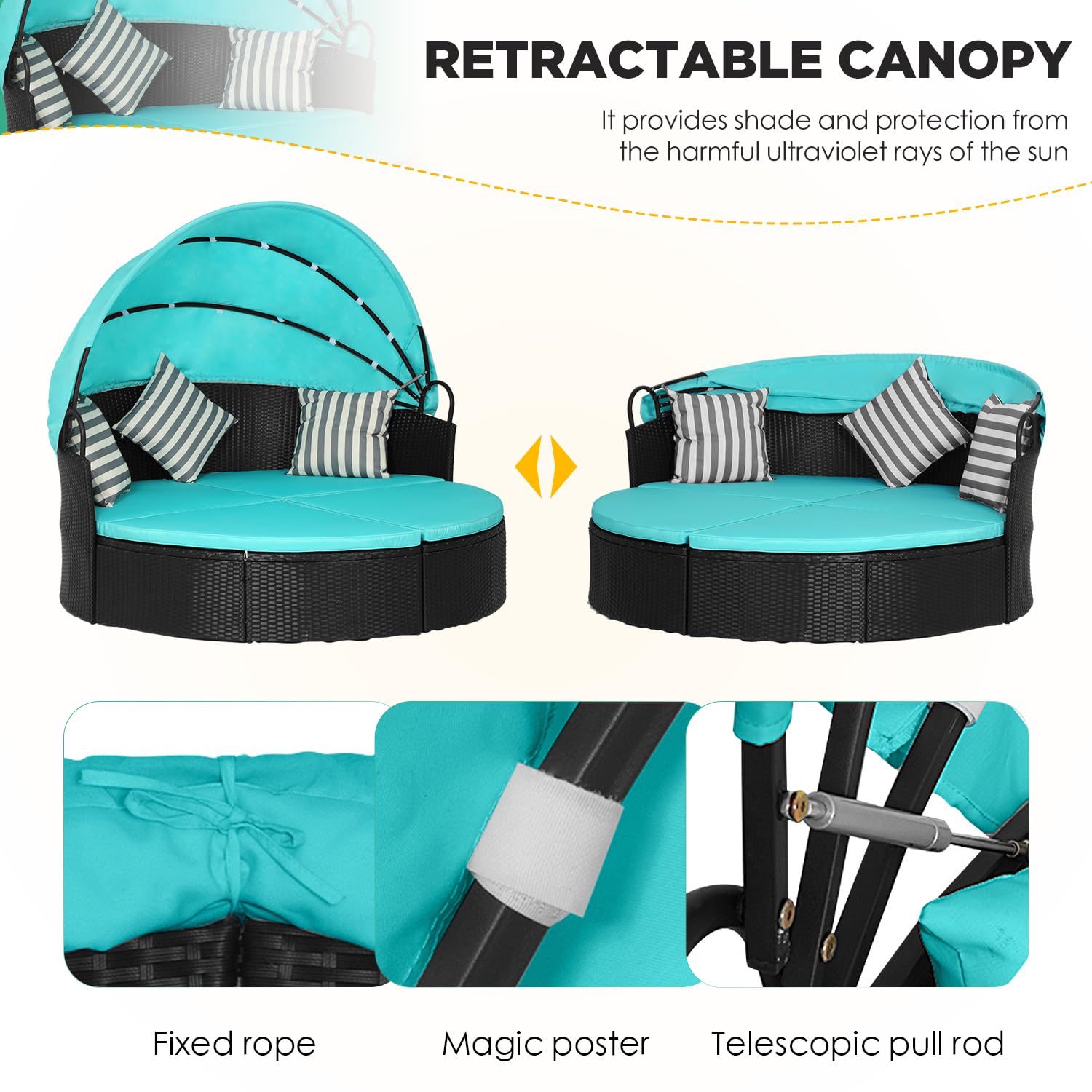 PayLessHere Outdoor Round Daybed Wicker Patio Furniture Outdoor Furniture with Retractable Canopy Rattan Separated Seating Sectional Sofa Washable Cushioned and Three Pillow for Patio Backyard (Blue)