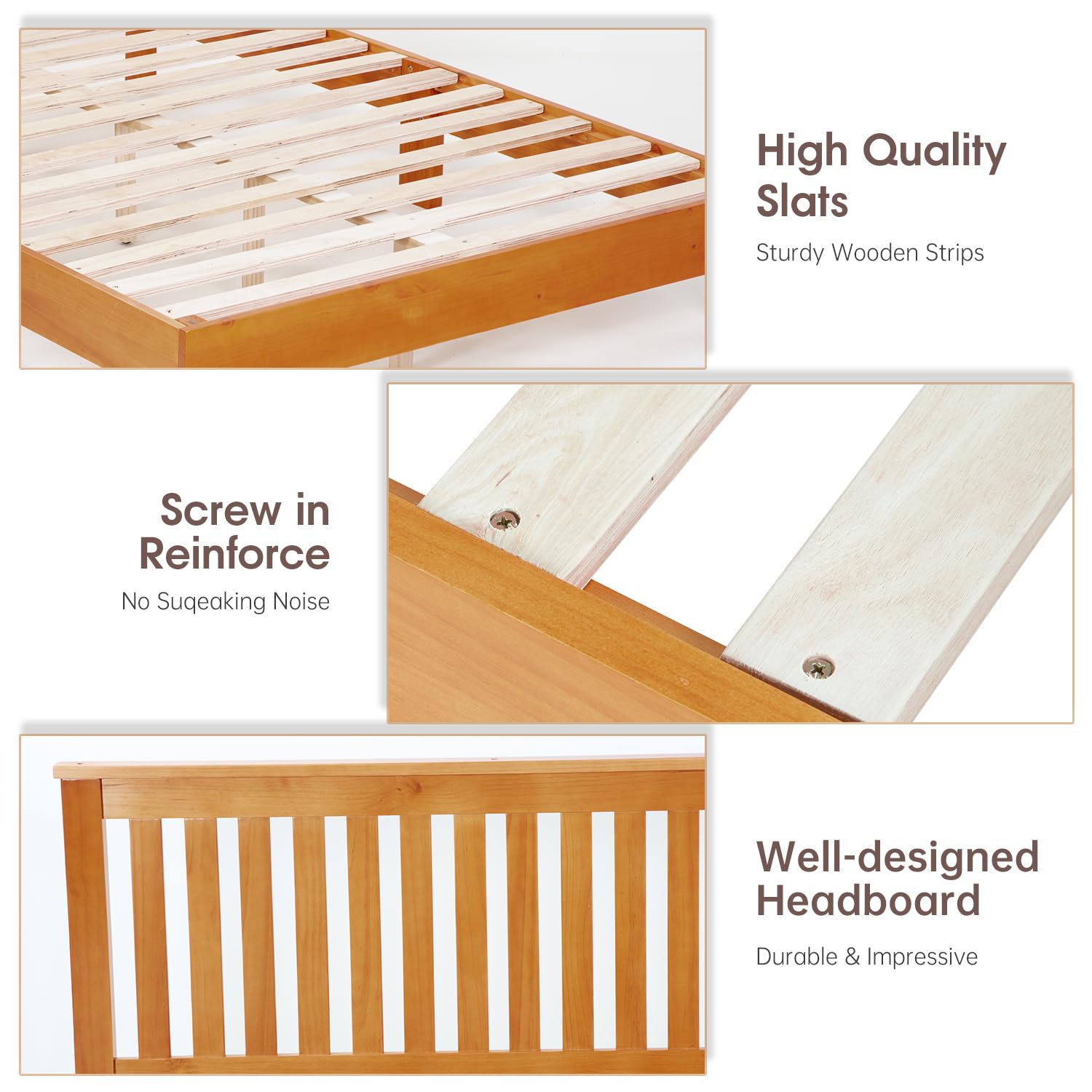 Say goodbye to the need for a box spring, thanks to the intelligently designed 14 wood slats support system. These sturdy slats are evenly spaced to ensure optimal weight distribution, preventing mattress sagging and enhancing comfort. Enjoy peace of mind knowing that your mattress is well-supported for years to come.