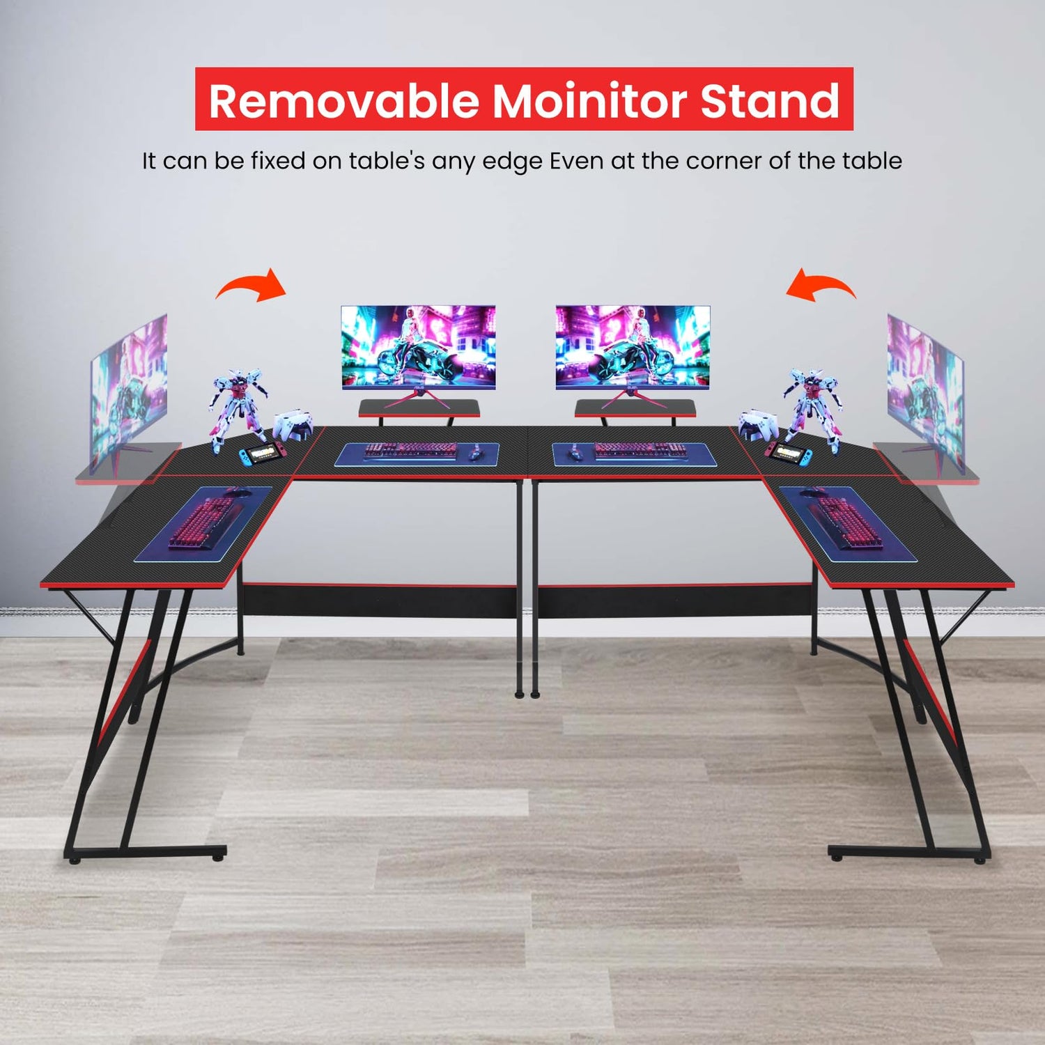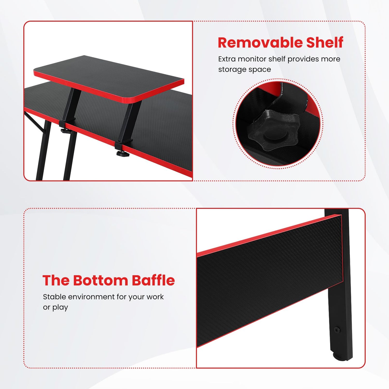 - 🎮【Large Gaming Surface】The L shaped gaming desk with 50.4"L x 17"W double desktops ensure your conversions around with ease while working/gaming. The gaming desk is up to 27.5"H, ample bottom space allows you to rest your legs and do some stretches after a long time work or anytime you feel tired.