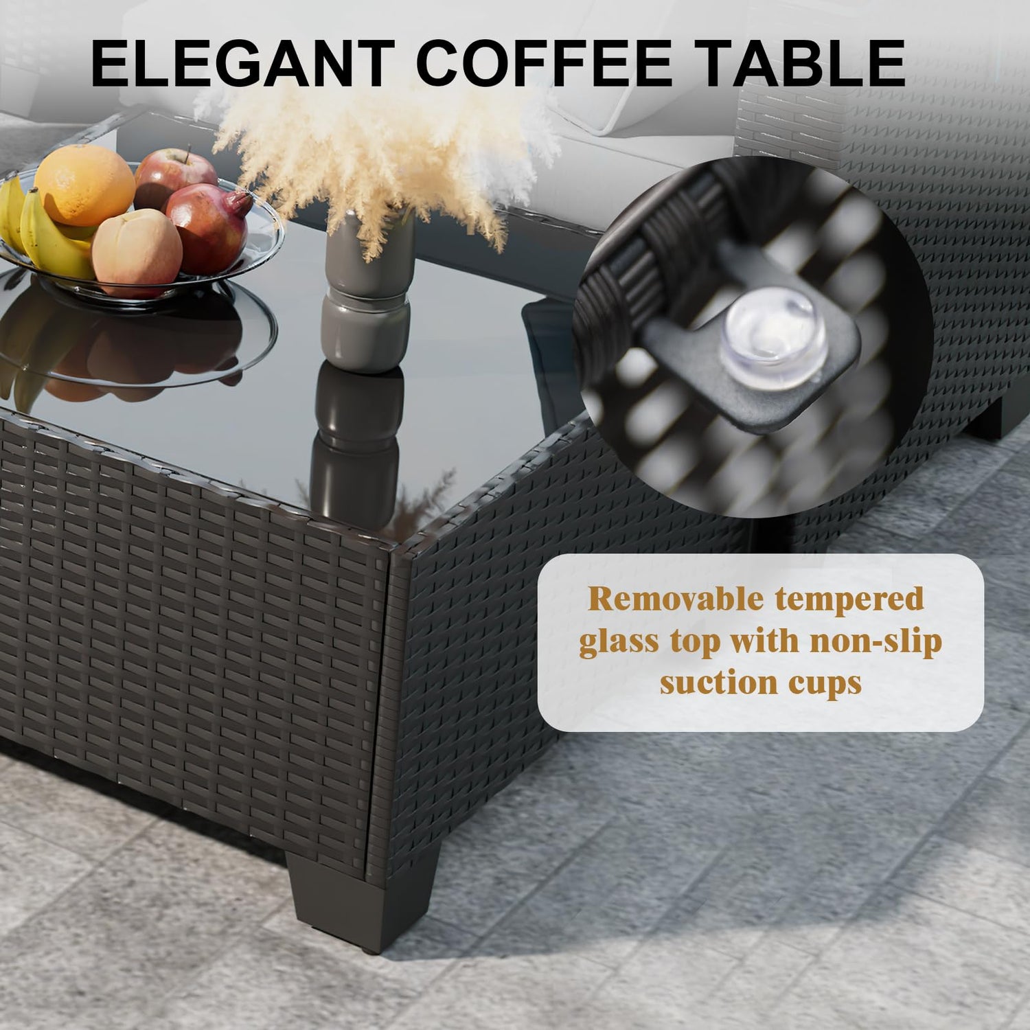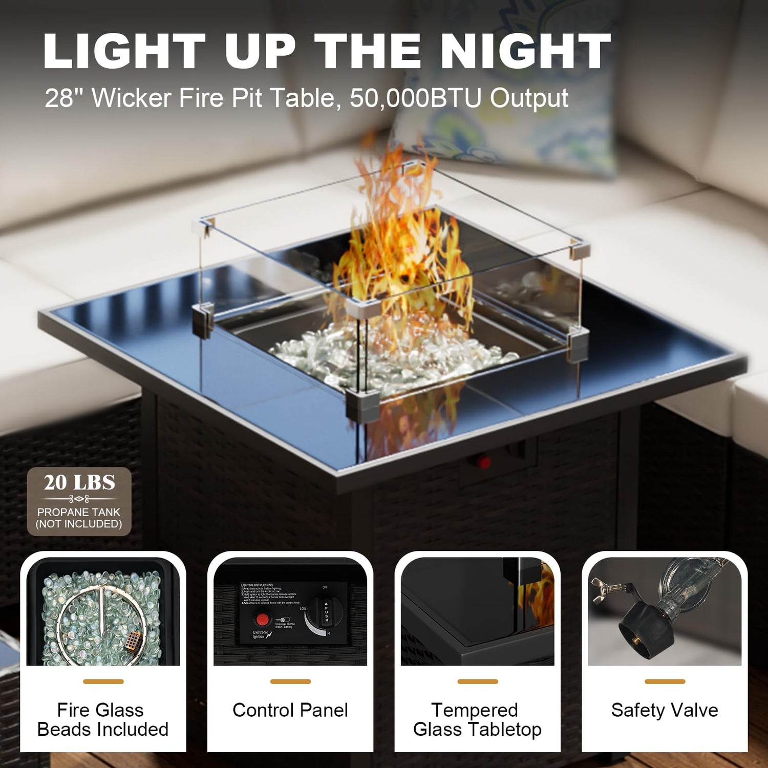 - Durable Material: Our patio furniture sets are made of durable but lightweight PE rattan wicker with a strong steel frame that is resistant to rust and corrosion. The thick cushions of the patio conversation set will give you optimal comfort and relaxation. The 28" propane firepit table is equipped with glass beads that can maintain even heating during furnace ignition, and the windshield can prevent the flames from spilling out