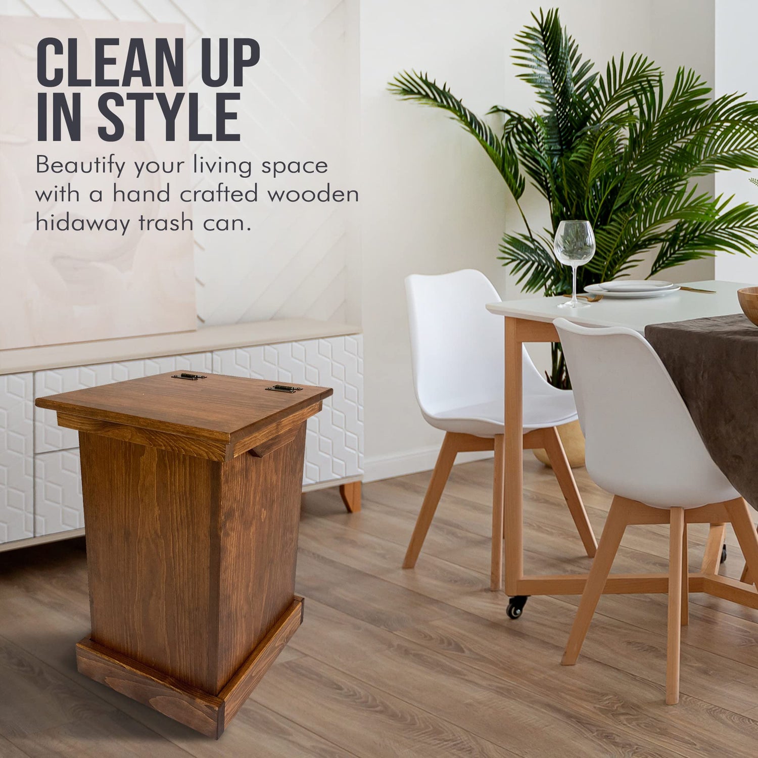 - UNIQUE DECOR: Beautify your living space with a hand crafted wooden hidaway trash can. Made from solid wood that is treated and finished in a variety of colors, our garbage cabinet for kitchens is made to last.