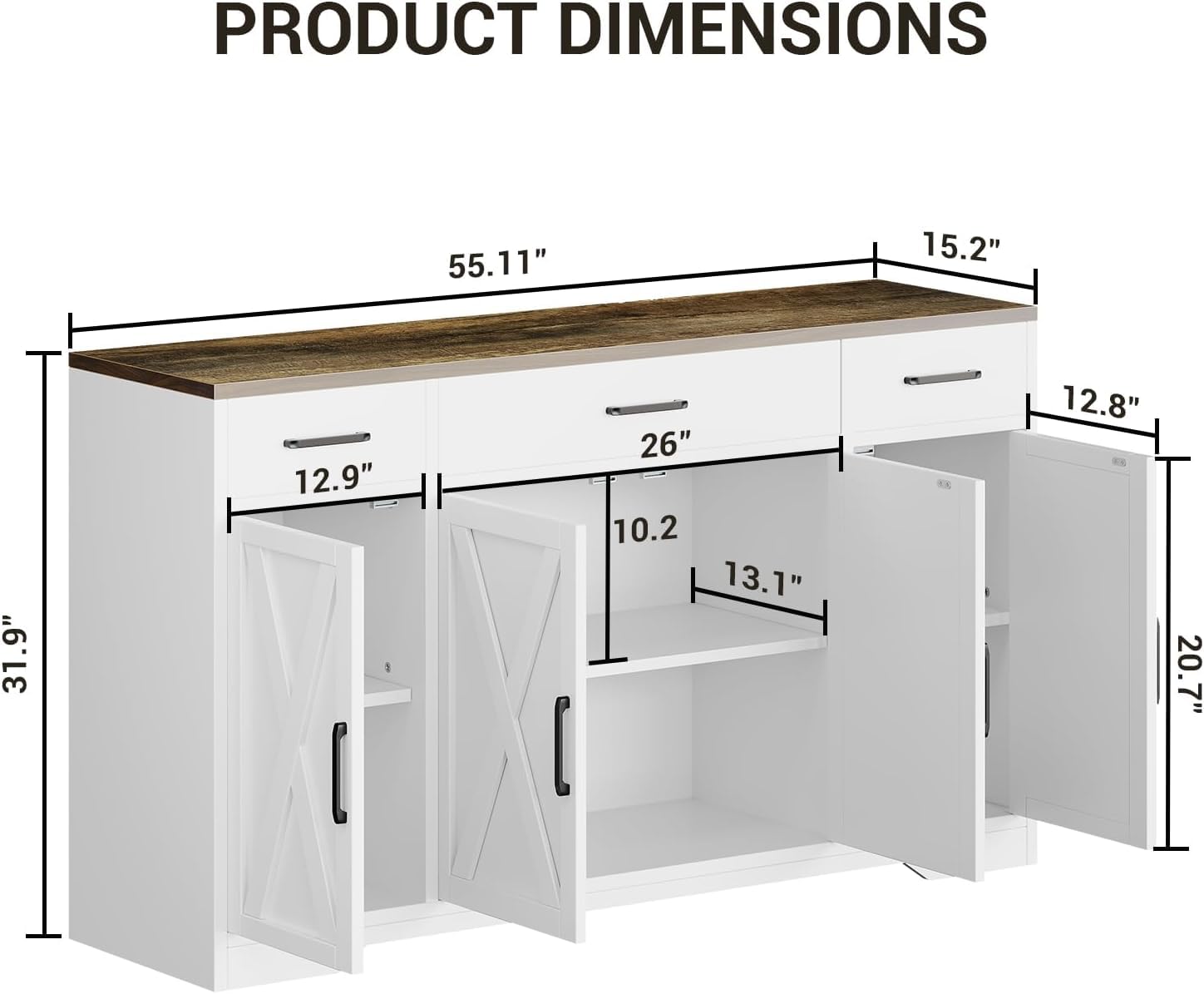 - [Easy Assembly] Dimensions: 55.11"D x 15.2"W x 31.9"H .The assembly of this sideboard buffet cabinet with storage is very simple. Buffet cabinets are provided with detailed instructions and labels. If you have any questions or need help during the assembly process, we will provide you with timely support and guidance.