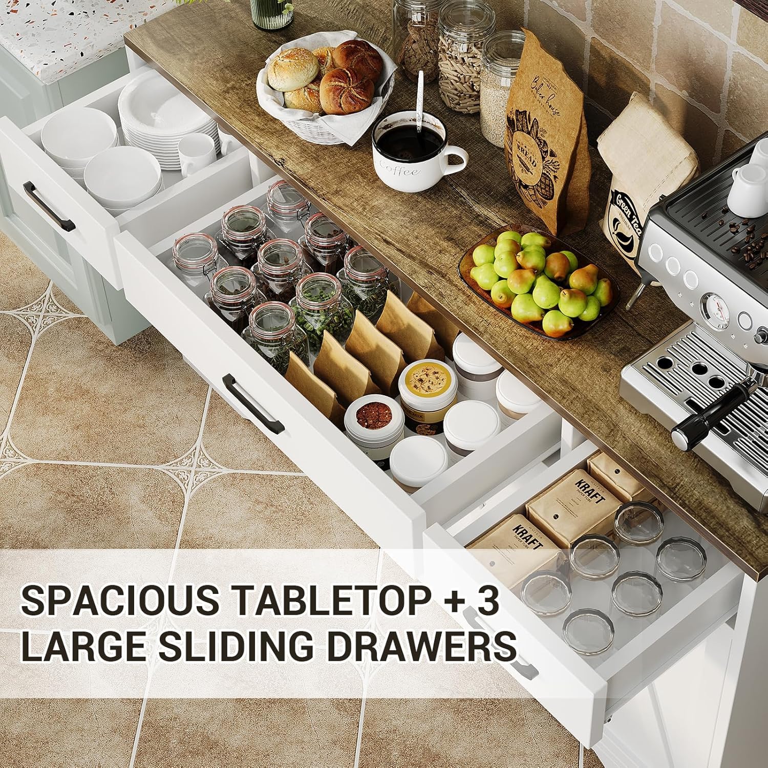 - [Large Kitchen Cabinet ] This buffet cabinet has a wide tabletop with three large drawers and plenty of space on top and internal shelving to provide plenty of storage. The internal shelves are adjustable in height to meet various storage needs. From plates and cutlery to jars and bottles, this versatile cabinet can be used as a kitchen buffet, sideboard or coffee bar to meet your storage needs in any room. The addition of a black handle adds a modern feel to the overall design.