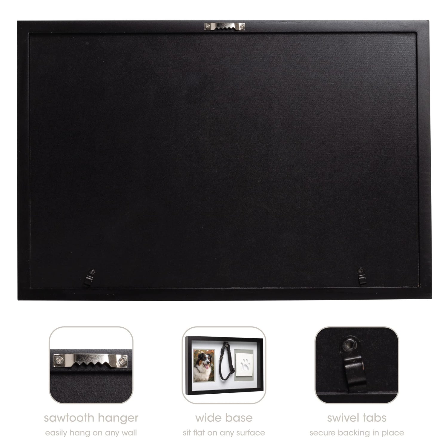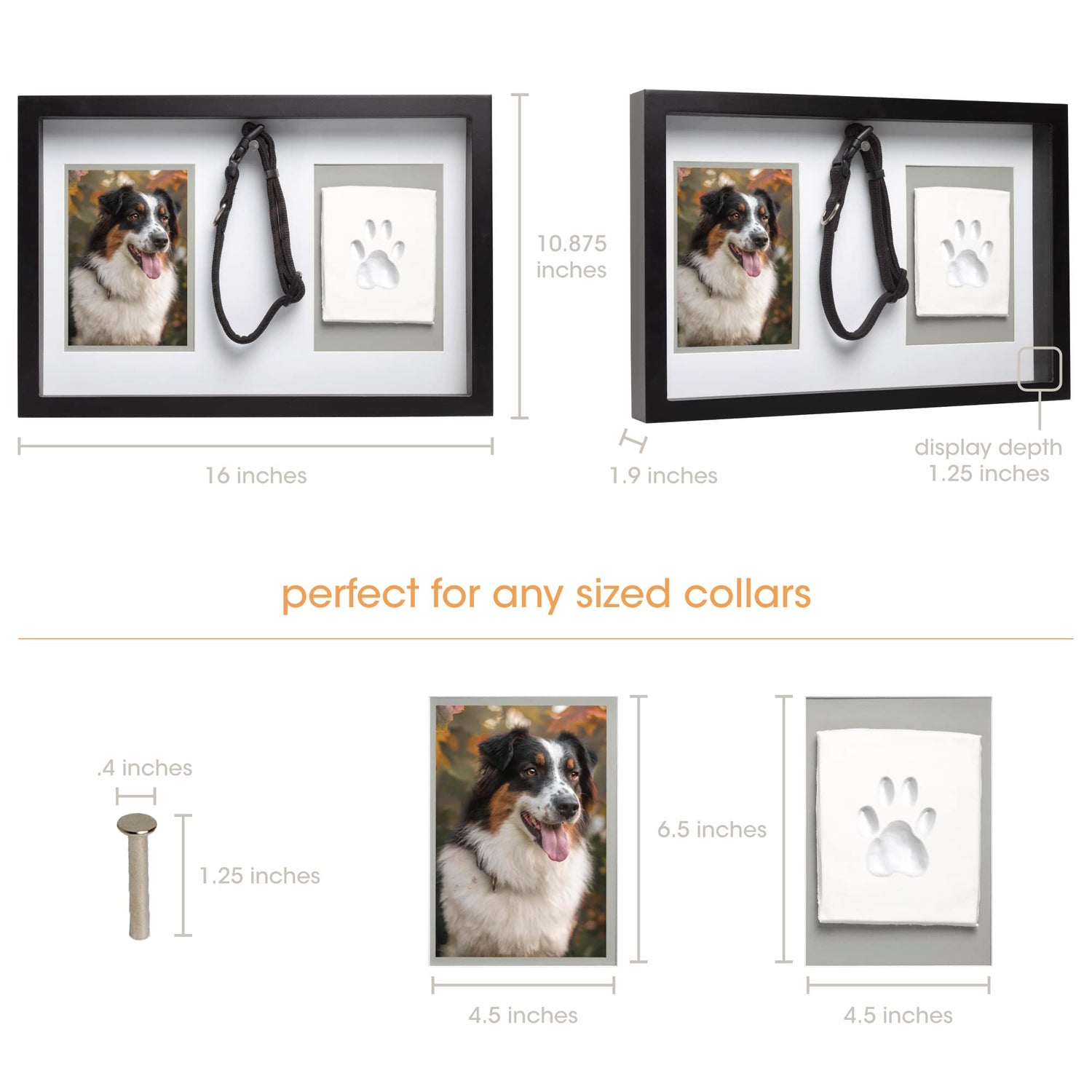 - DIMENSIONS - Frame: 16”W x 10.875”H x 1.9”D; Collar Hanging Pin: 1.25”; Display Depth: 1.25”; Photo and Pawprint Inserts: 4.5”W x 6.5”H