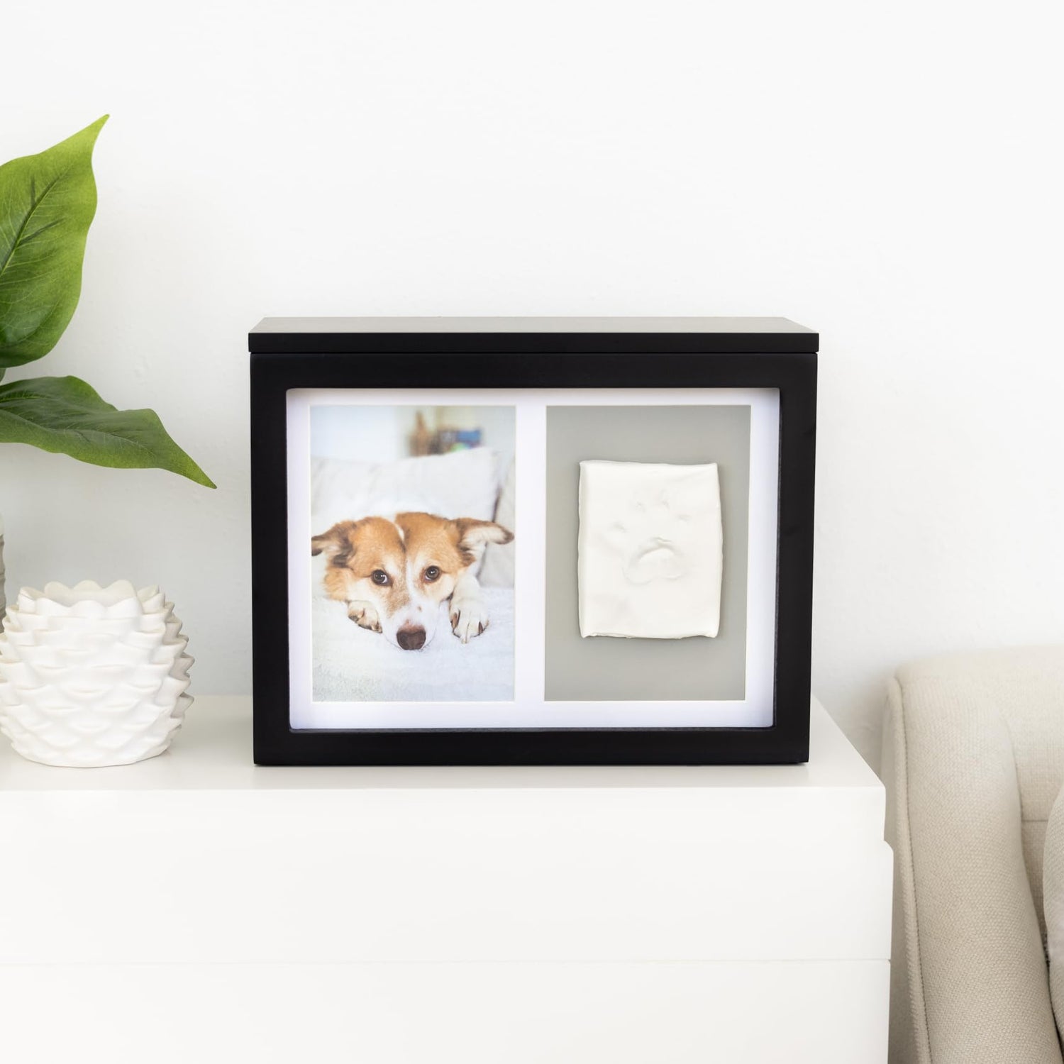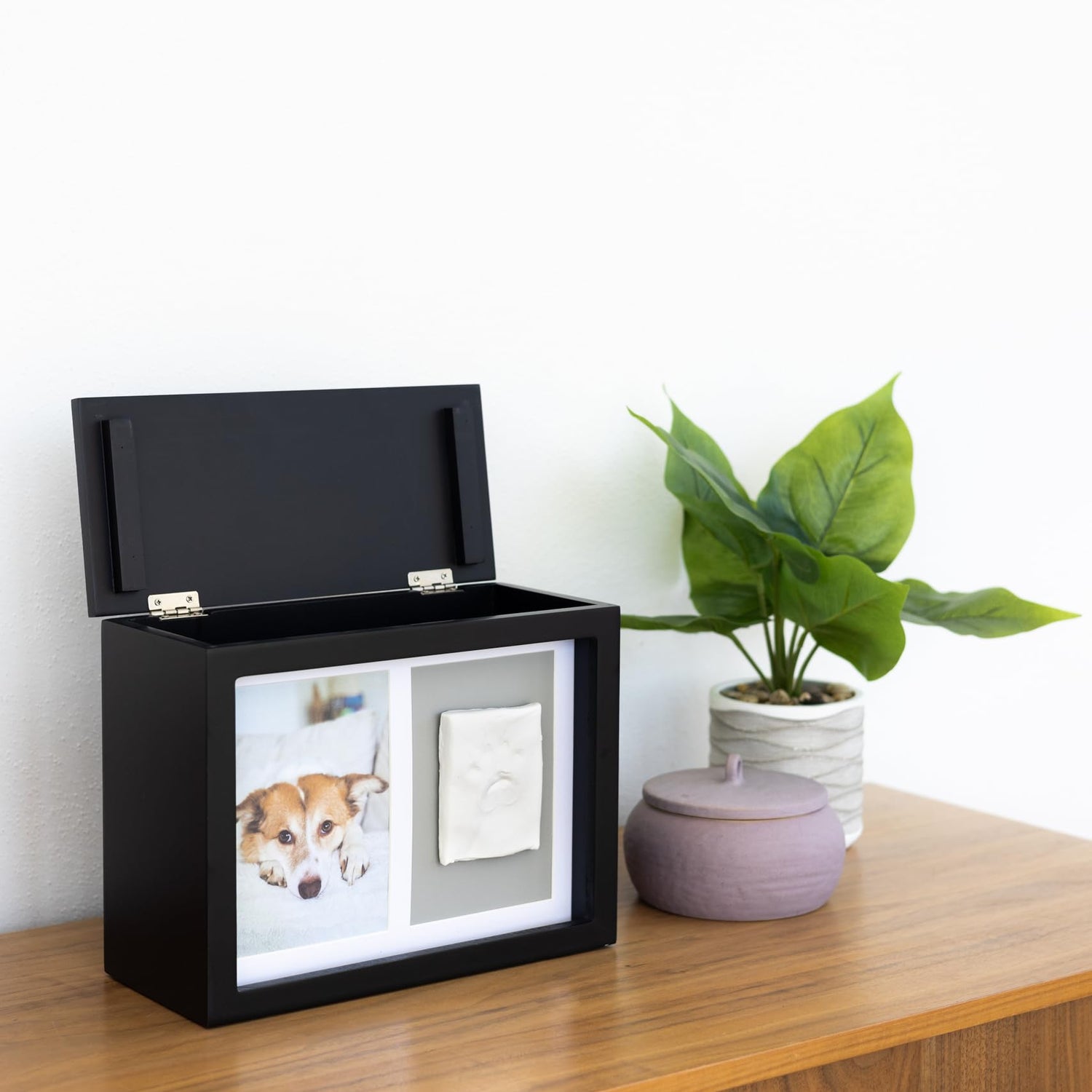 - Multi-Use Keepsake: Beyond ashes, it's spacious enough to store favorite toys, collars, and leashes. To create the paw print, knead the clay, roll it out, press your pet’s paw into it, and let it dry for 1-2 days before mounting it on the provided mat. Dimensions: Box: 10.11” W x 7.87” H x 4.48” D; Photo and print openings: 4” L x 6” W, accommodating pets up to 100 lbs.
