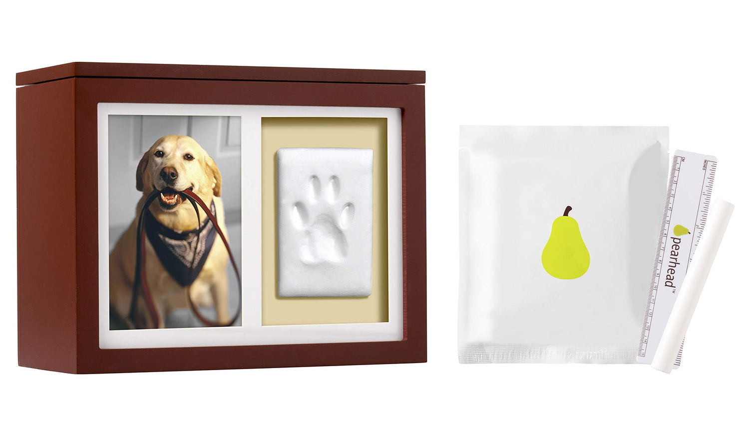 Details: Your pet will always be part of the family. Always and forever cherish their memory with Pearhead’s pawprints memory box. This espresso, wooden box includes a 4" x 6" photo insert to display your best friend picture. Before your pet goes on to the rainbow bridge, make their print with the included 100% Pet safe clay. The box includes one package of soft, air drying clay, a ruler for cutting, a roller, and double-sided tape. Simply knead the clay for 2-3 minutes and roll it out. Press your pet’s paw in the clay gently but hard enough to create an impression. If you make a mistake - no problem; you can redo it as many times as you need until you get the perfect impression. Once finished making the print, use the ruler to create a square around the impression. Then let dry for 1-2 days and use the double-sided tape to stick the print to the beige backboard mat. This keepsake memory box can be used as an urn to forever cherish your cat or dog. The lid of the box is hinged, making it simple to open and close and place the print, picture, and ashes inside. The large box will fit ashes for an animal up to 100 lbs. You can also store your pet’s leash, collar, and favorite toys in this memory box for safe keeping. While your pet might be gone, their memory will forever live on and you can always keep them close with Pearhead’s pawprints memory box. At Pearhead, we aim to create genuine, quality products to celebrate your special moments in life. We are a family of designers, marketers, and trendsetters bringing products to life that will bring a smile to your face. From concept and design to production and customer service, the Pearhead team works together seamlessly every step of the way. Whether your baby is celebrating their first year of life, you are announcing your pregnancy, or your pup is celebrating his first holiday season, Pearhead is here to share your moments in style. Product dimensions: 10.11" W x 7.87" H x 4.48" D; photo insert: 4" x 6".