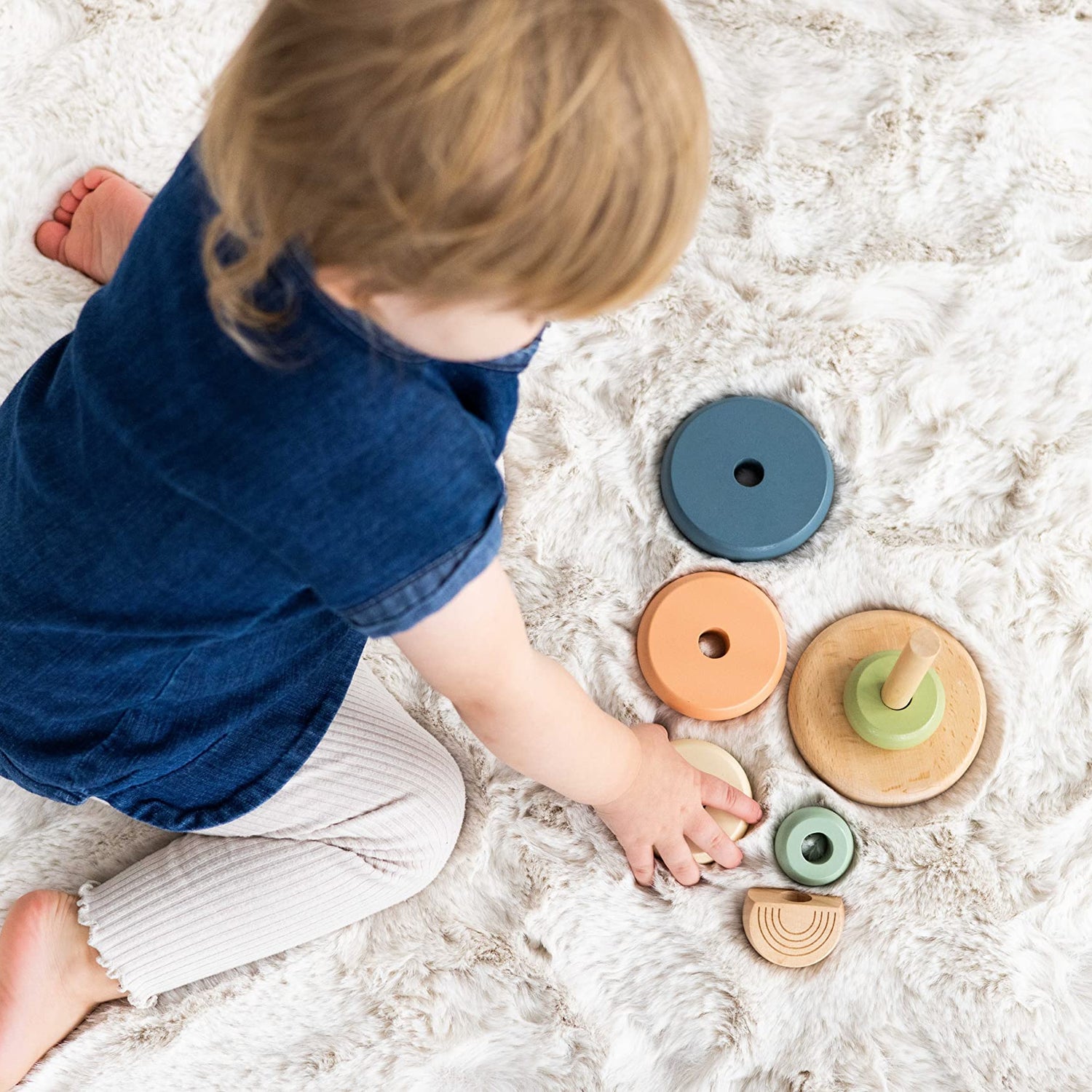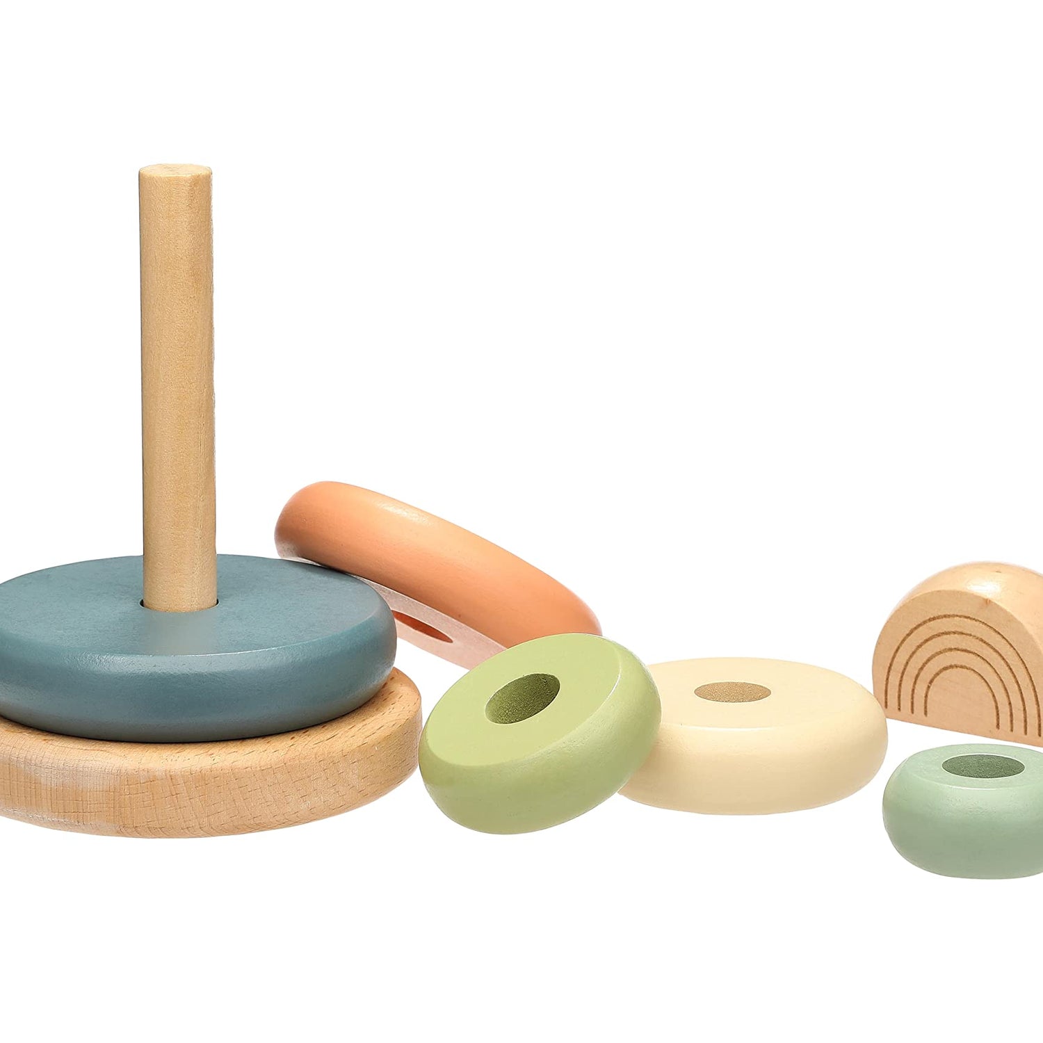 - Includes wooden base and peg with 5 multicolor earth tone rings and a wooden rainbow topper; for ages 12 months and up
