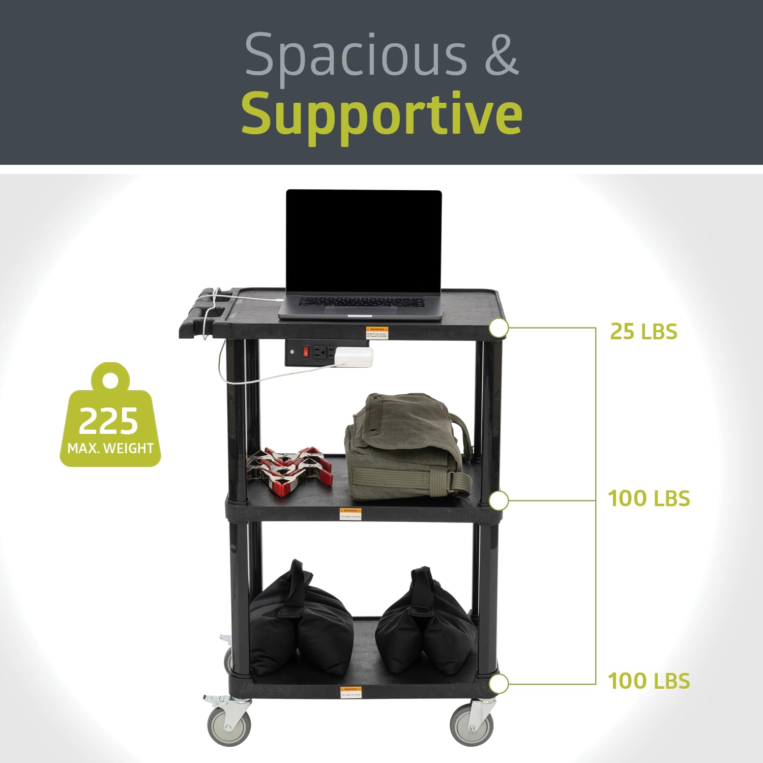 - EFFICIENT DESIGN: Features 3 spacious, flat-top shelves with ergonomic lipped edges and a 3-outlet power strip with an 8' cord to accommodate electronics, keeping them charged and easily accessible
