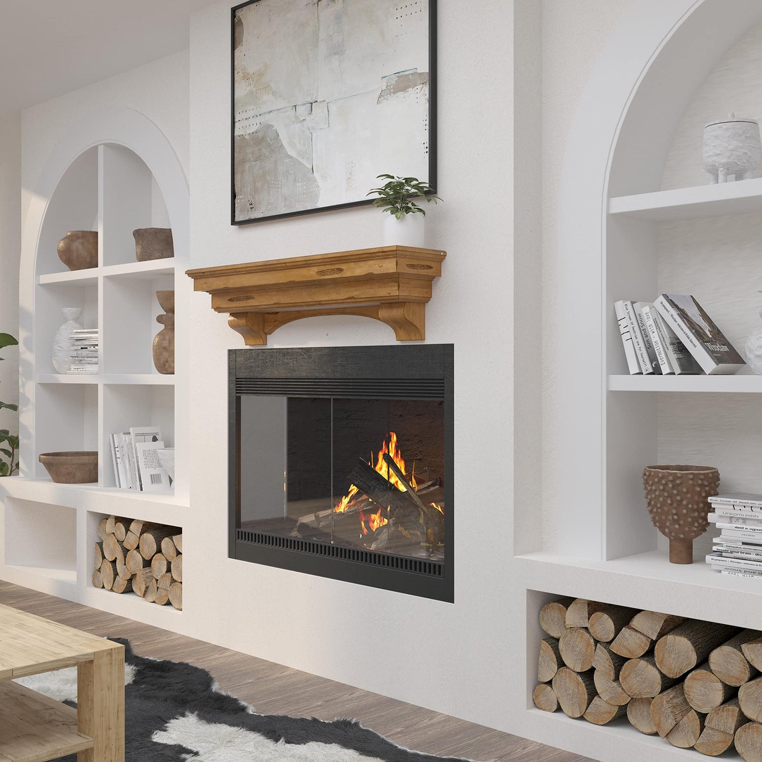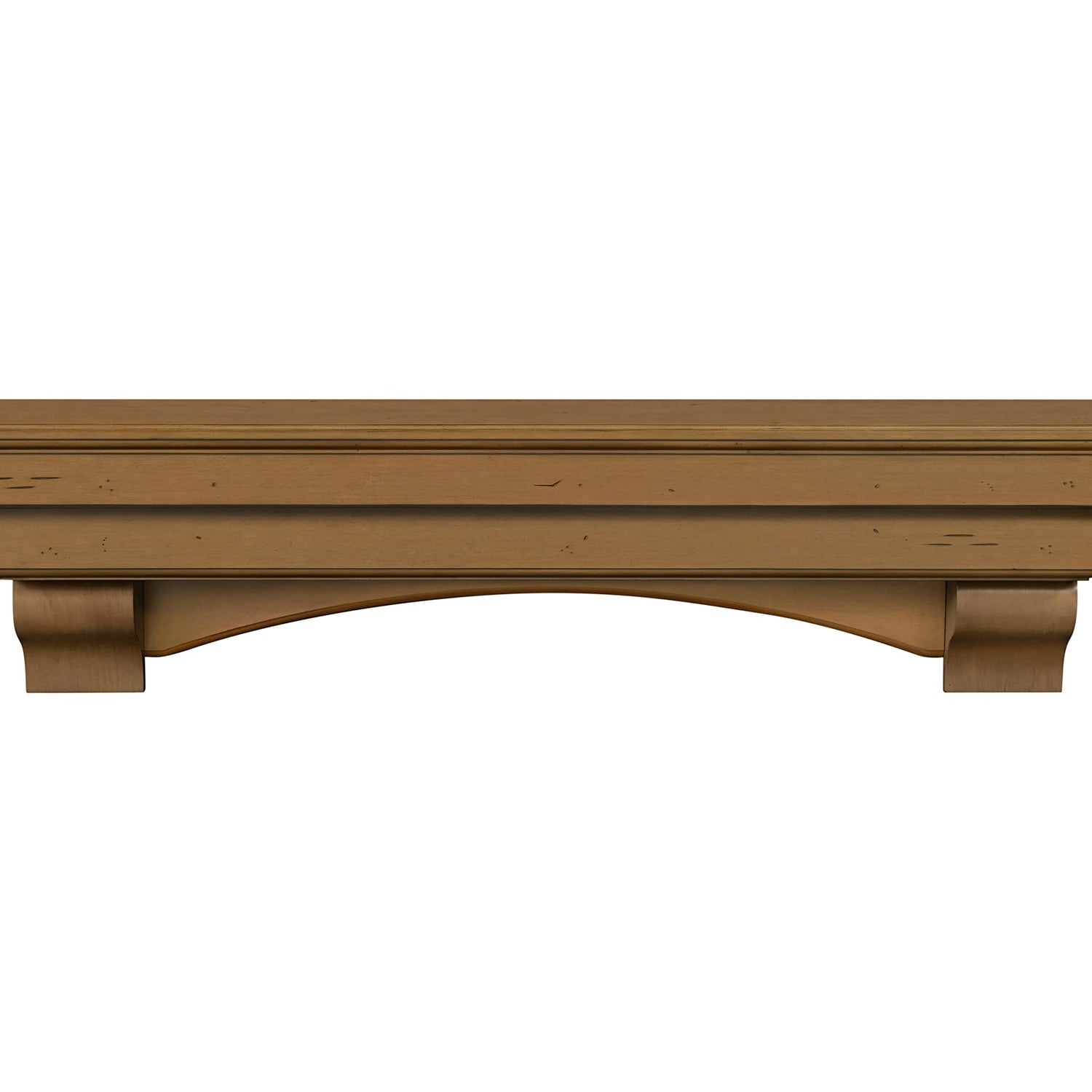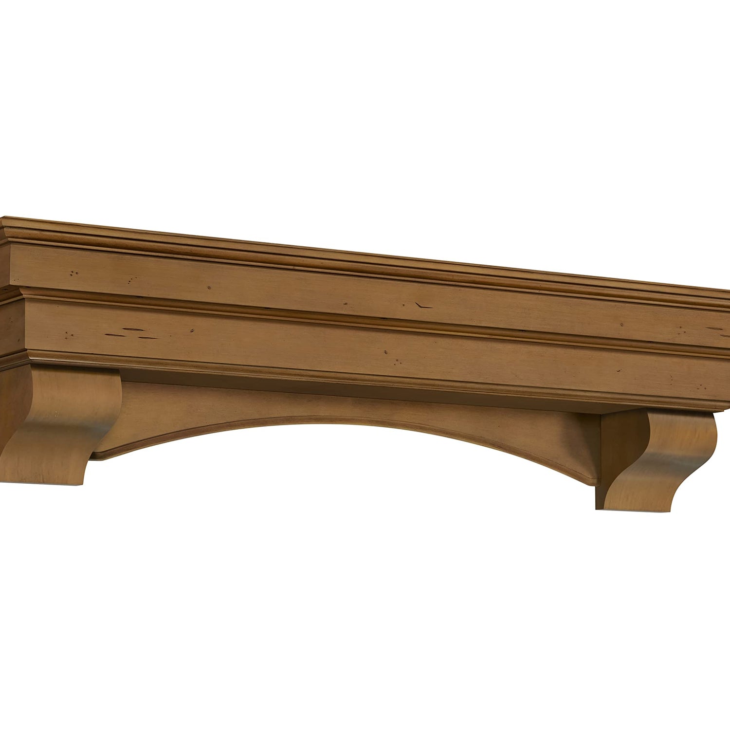 Details: There's nothing as warm and welcoming as a crackling fire in an open fireplace. The dancing flames can lift your spirits and melt away the most stressful day in a matter of minutes. But to truly be part of the home, a fireplace must warm our hearts even when there is no fire in the grate. Pearl does not treat the mantel as trim or molding but as a beautiful piece of furniture that is the focal point of the entire room, the emotional core. It represents roots, heritage and tradition. Furniture is arranged around it, precious treasures are displayed on it, and it provides balance and stability to the entire room. Pearl Mantels features fine furniture quality, stunning details and classic designs that will enhance any decor. Three design choices! The shelf comes to you with three separate design components consisting of the shelf, a pair of corbels and the arch. You will have the option of installing just the shelf, the shelf and the corbels together or the combination of the shelf, corbels and arch. Hand crafted and pre-distressed from New Zealand Pine in our Antique finish. Hand-hewn edges and distressing enhance the natural beauty of the wood grain. Whether your design taste is clean, classic, traditional, we have you covered. For your hearth and home. Mitered hanger boards are included for ease of hanging. Shelf Length: 72" Shelf Depth: 10" Bottom Base Depth: 6" Overall Height with Corbels: 15" Height Corbels: 6 3/4" Width Corbels: 6" Width between Corbels: 52 1/2" Radius: 99.712 Weight 42 pounds. Look for the pearl inlay that graces the right hand side of the shelf as proof that you have received an authentic Pearl Mantel.