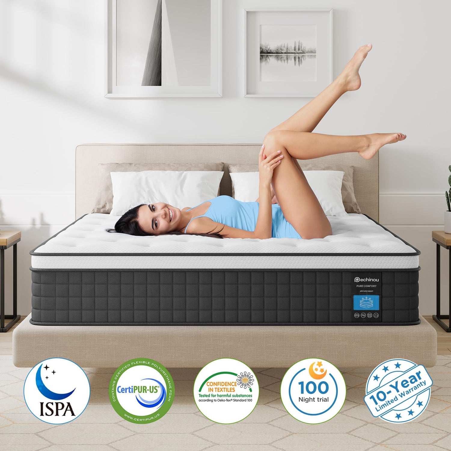 - QUIET AND PEACEFUL SLEEP: The PECHINOU king spring hybrid mattress is made of high-quality knitted fabric; a multi-layer high-quality sponge keeps you away from back pain. All memory foam is CertiPUR-US certified and tested to be free of harmful substances.