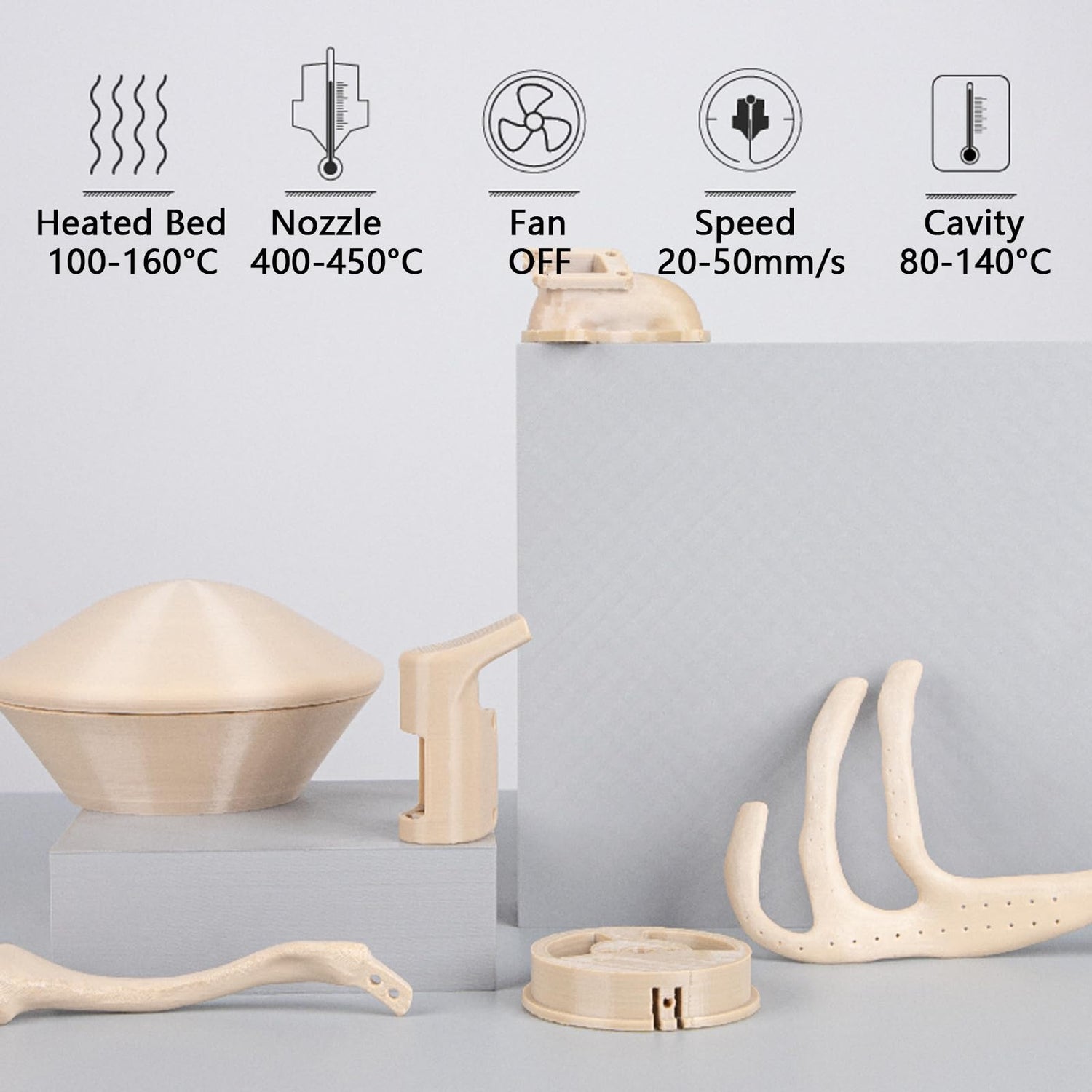 - Extruder temperature: 400-450°C, Hot bed temperature: 100-160°C, Printer cavity temperature: 80-140°C