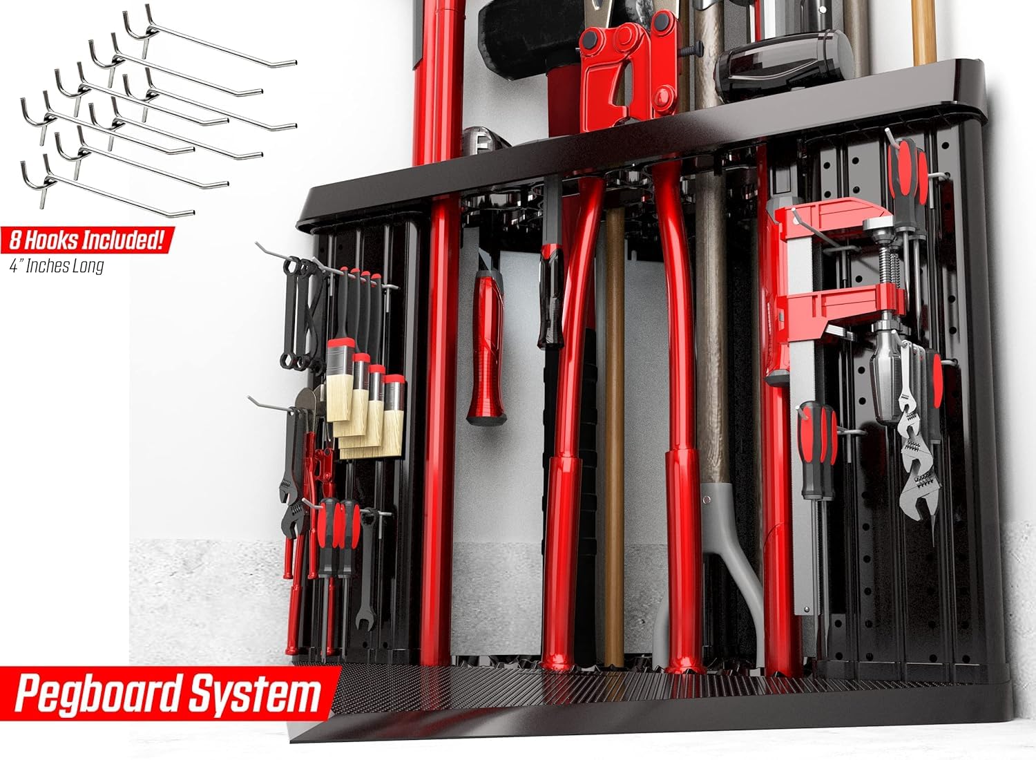 PeerBasics Corner Tool Rack, Garage Storage Organization, Up to 40 Tools like Shovels Brooms Rakes Mops Hammers Pruners, Organize Garden Yard Plus Pegboard, Wall Mounting, Peg Hooks Hardware