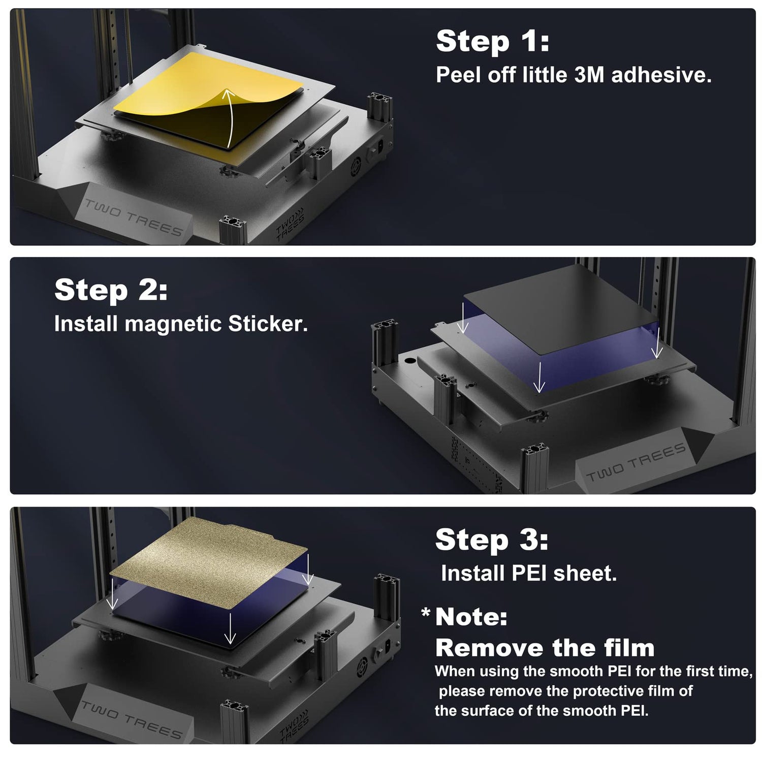 - Double Sided Design - The Pei Foil consists of 2 parts, a flexible steel platform with double-textured Pei surface and a magnetic print bed with adhesive on the back. Simply stick the PEI magnetic sheet onto your heated bed, then place the steel platform with PEI coat on top.