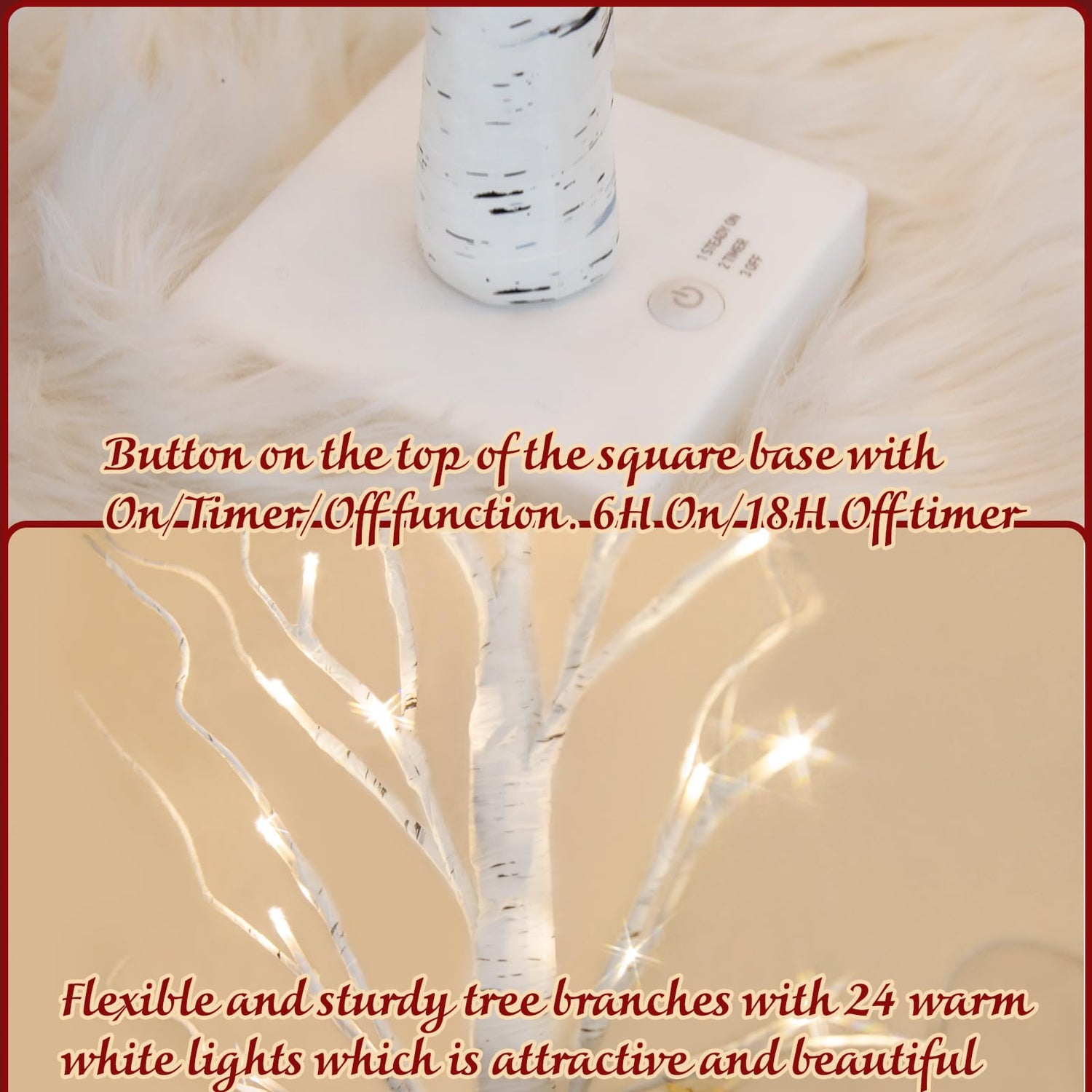 - Lighted Birch Tree: Overall height of 2 FT with a 4 Inch square base and 24 warm white lights; The tree trunk and branches are wrapped in birch bark looking tape which is attractive and beautiful