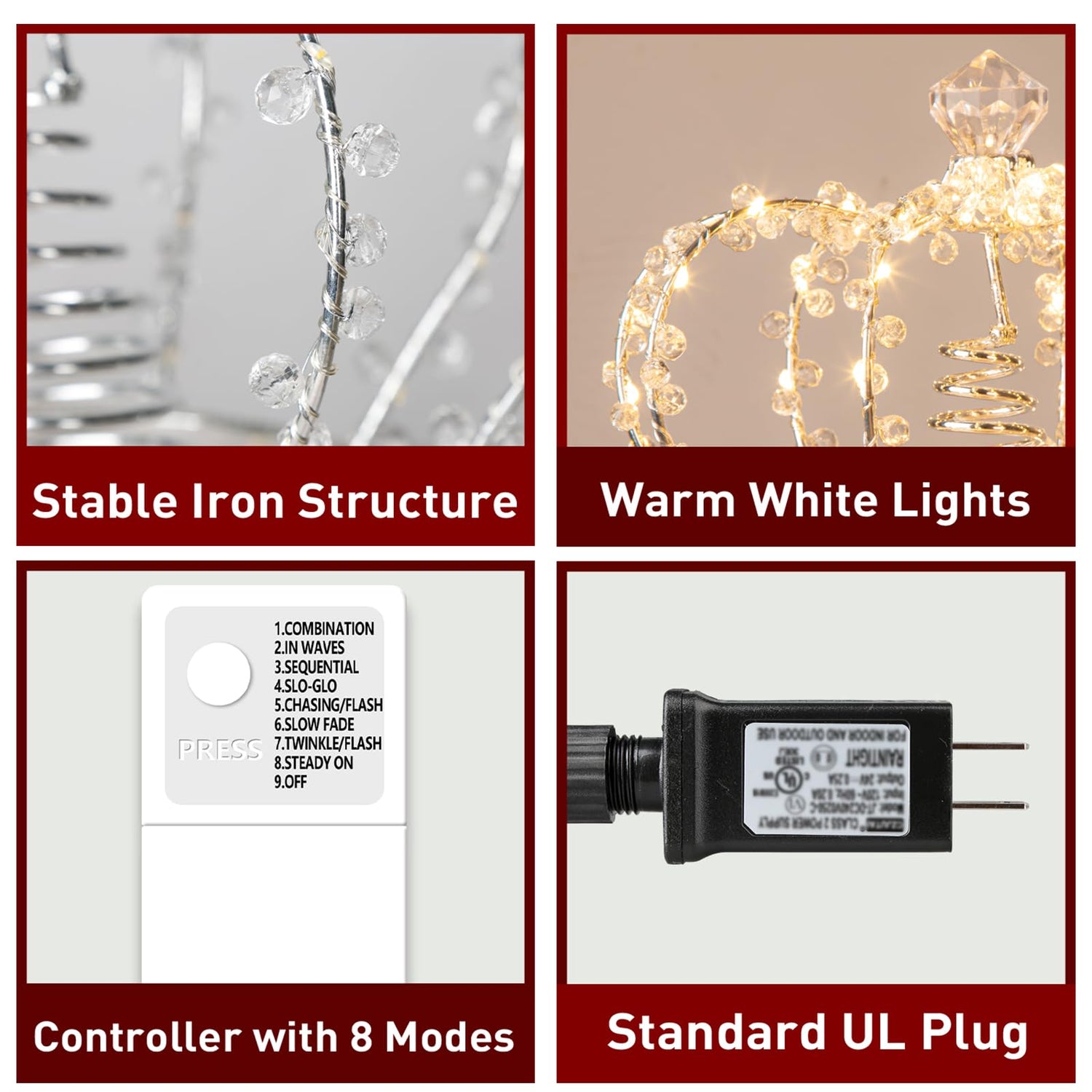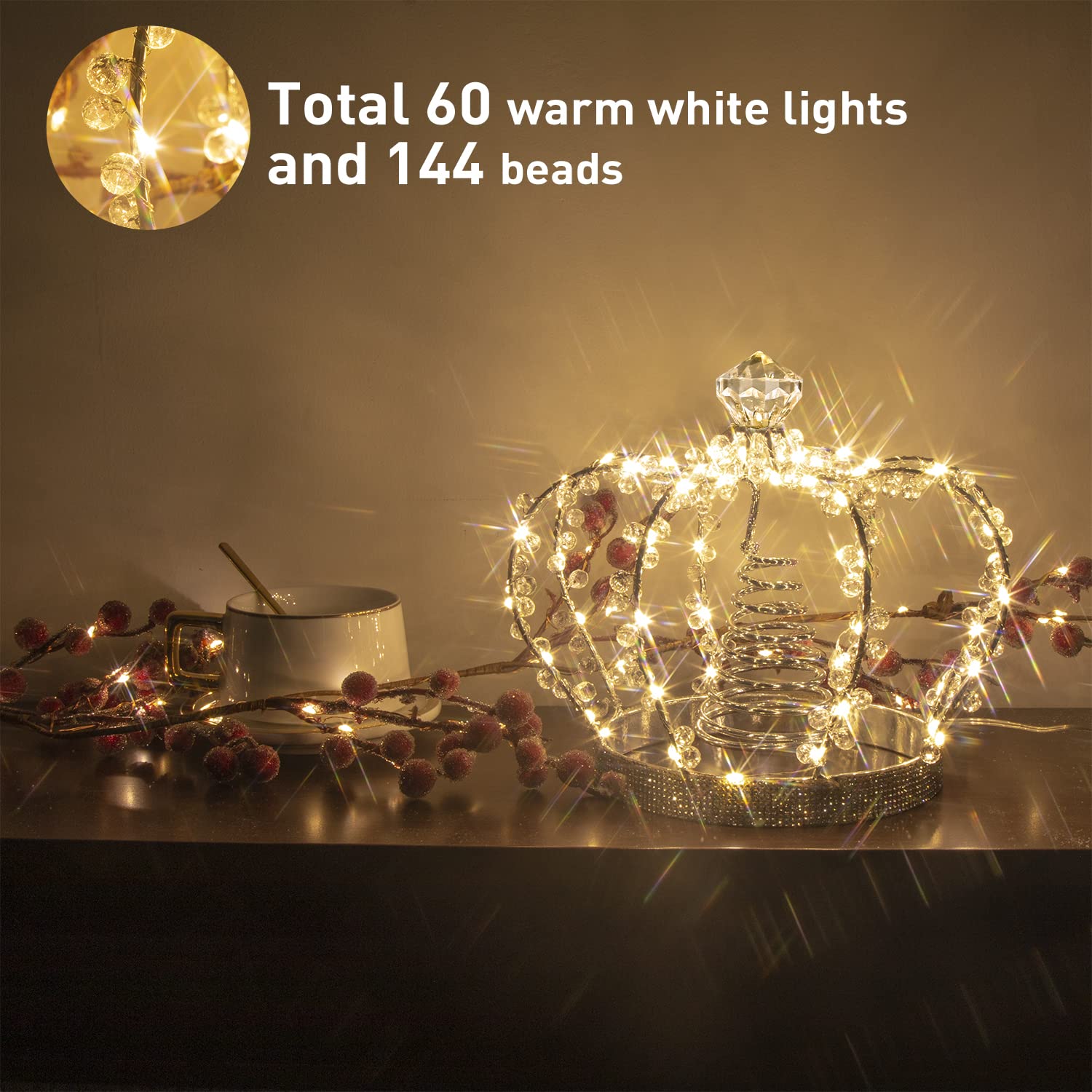 - Unique Tree Topper: Christmas crown tree topper measures 9.5 * 7.75 inches; featuring a large diamond; 144 transparent bead ornaments; and 60 warm white LED lights; adding a magical touch to your Christmas decorations