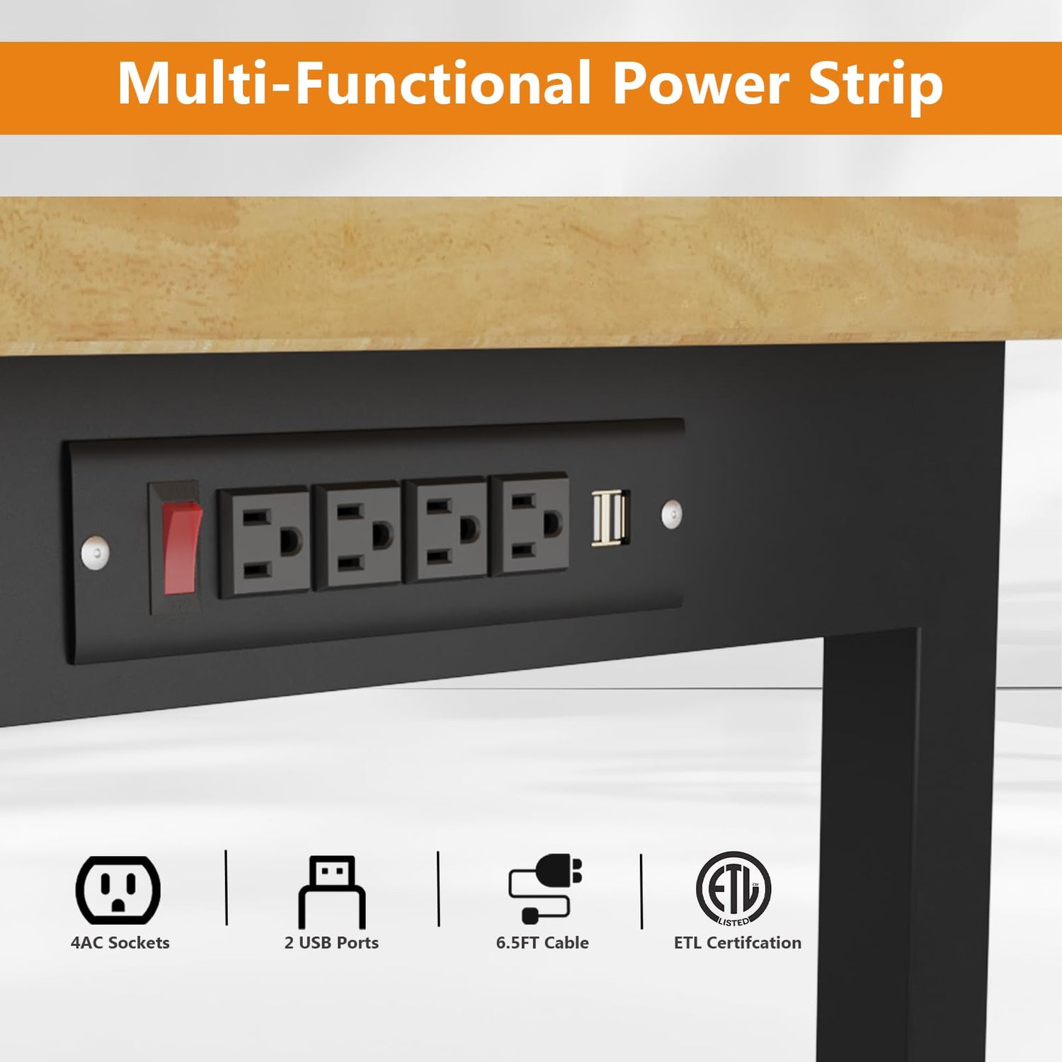Pelnuies 48" Work Bench, Adjustable Height Workbench with Rubber Pad, Heavy-Duty Solid Wood Work Table with Power Outlets, 2000 LBS Capacity Workstation for Garage, Workshop, Office, Home