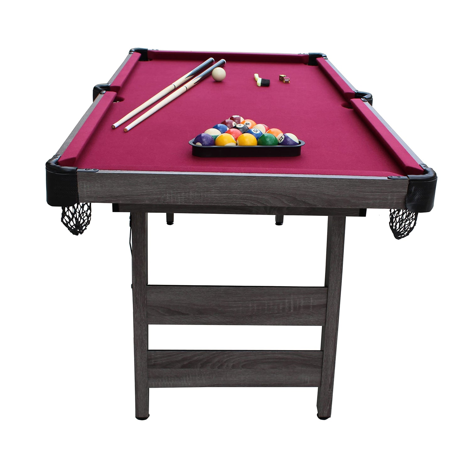 Details: Specifically designed for smaller spaces and portability, the unique Pendleton 6-ft Pool Table is the perfect addition to any game room, basement, or den. Its compact, 6-foot frame is perfect for kids learning the game and adults will appreciate its high-quality construction and simple, space-saving design. This table features 2.2-in wide top rails wrapped in a durable, farmhouse-inspired melamine, fast-action cushions, and a playfield covered in burgundy blended polyester felt. Super easy to set up and even easier to store, this table is certain to provide hours of fun and competitive play for both children and adults alike. Includes all pool table accessories needed to play a competitive game of pool. 180-day limited warra