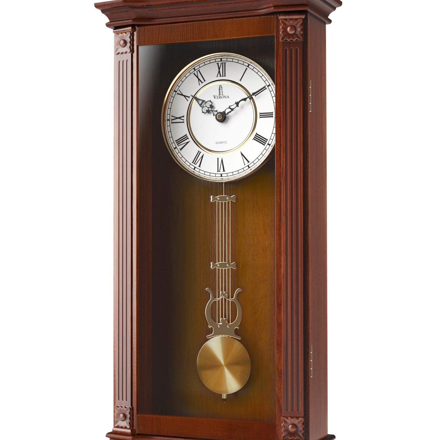 - ELEGANT. CLASSIC. VINTAGE. Get ready to fall in love with our premium Verona Wooden Pendulum Clock! It will take your home to the next level sophistication and elegance. Our classy grandfather clock measures 27.25x11.25 inches, and is made out of thick and durable wood that is carved with precision and detail. You will swoon over the white dial with easy-to-see black Roman numerals, decorative glass casing, and beautiful gloss finish that adds character and style to any room in your home