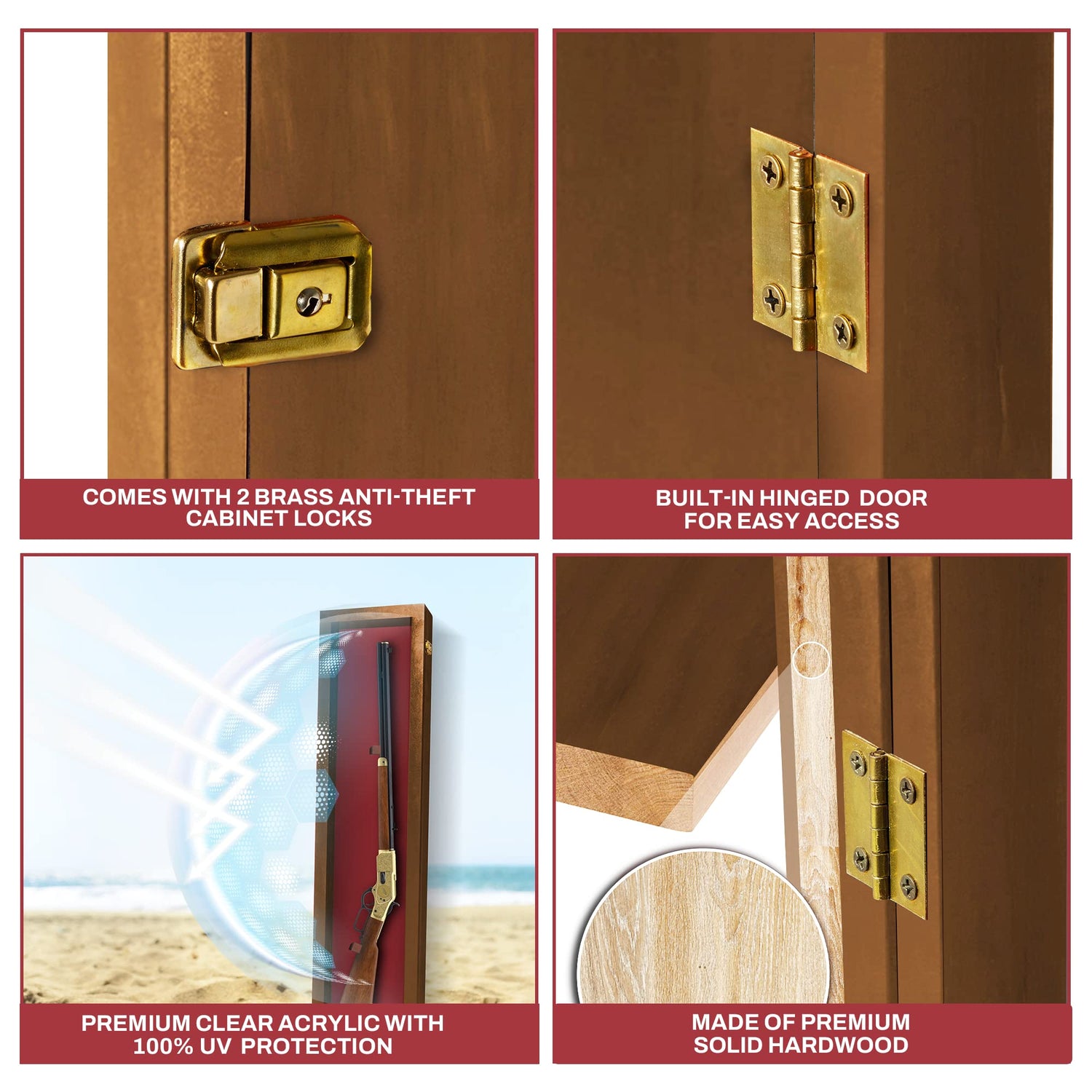 - Premium Sword Display Case: Proudly made in the USA, our rifle display case is handcrafted from solid basswood with a glossy walnut finish and red felt background. Our gun case is lockable and includes 2 pegs, 2 screws, 2 golden locks, & 2 keys.