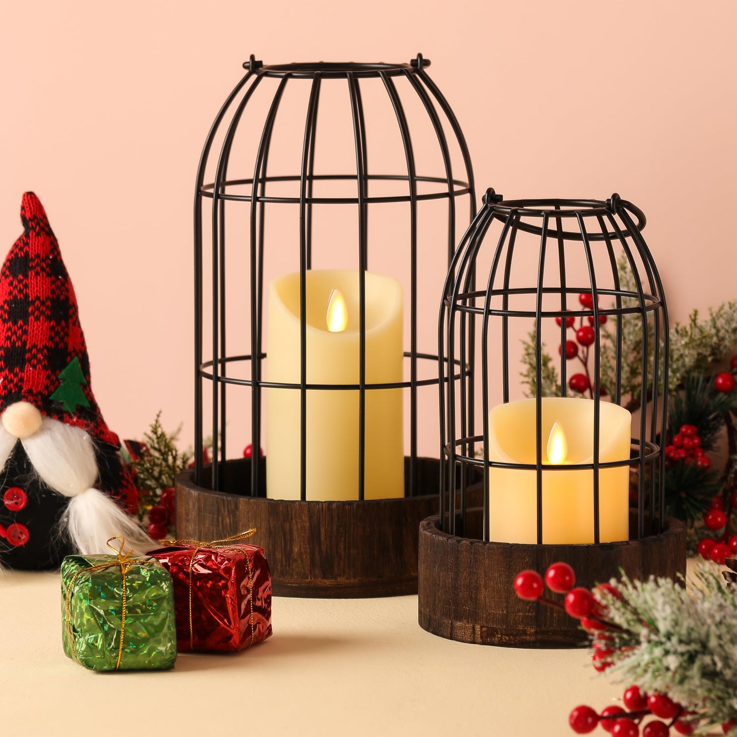 - 【Modern Farmhouse Lanterns for All Season】Liven up your home decor with these lanterns that have a modern farmhouse aesthetic. The set of two lantern candle holders is an excellent addition to any room, and you can even add seasonal accents for Halloween, Christmas, and other occasions. The rustic finish with the stylish metal wire and wooden stands in a distressed white look makes them a stylish choice for any decor.