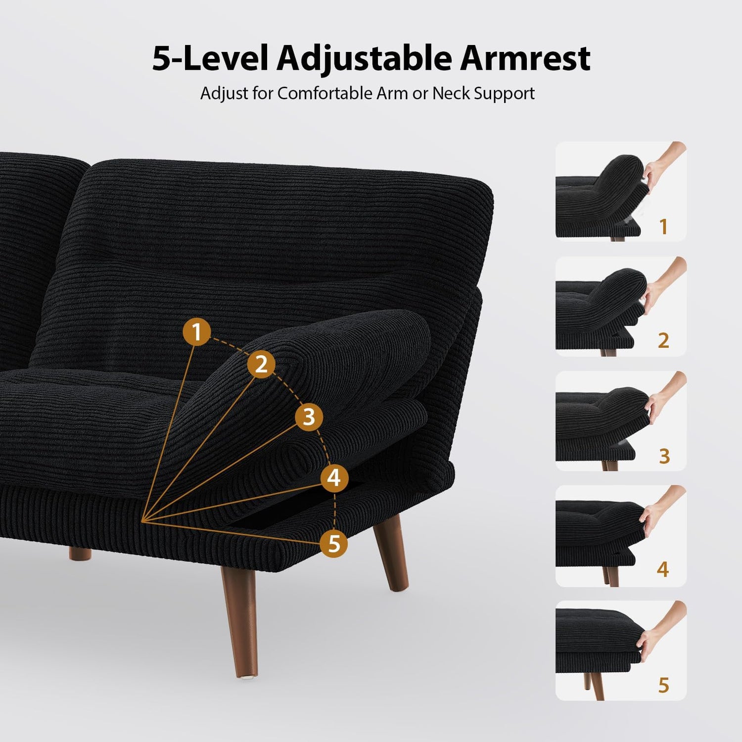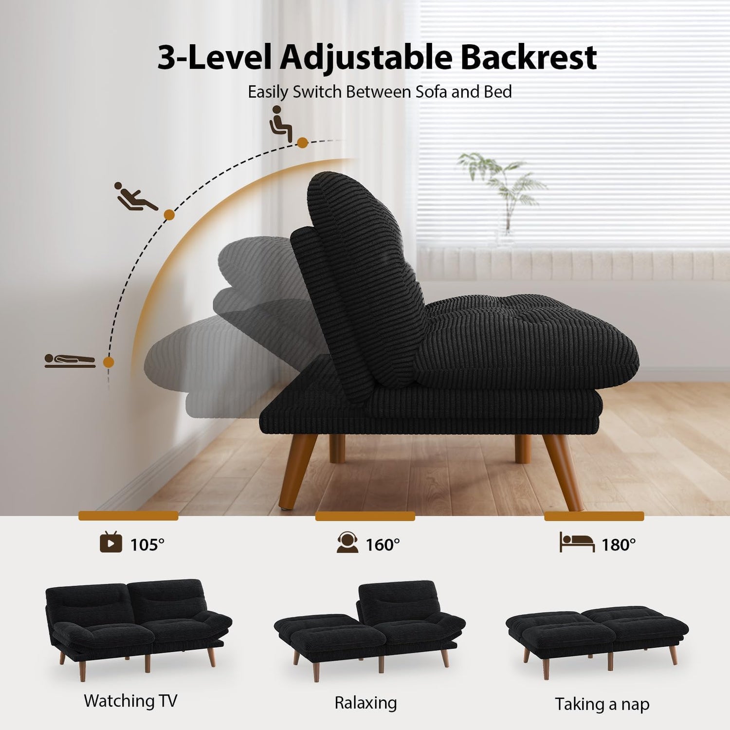 PERLECARE Convertible Futon Sofa Bed, 66" Corduroy Futon Couch with Adjustable Backrest and Armrests, 3-in-1Recliner Sleeper Sofa for Small Spaces, Play Room,Living Room or Office(Black,66 in)