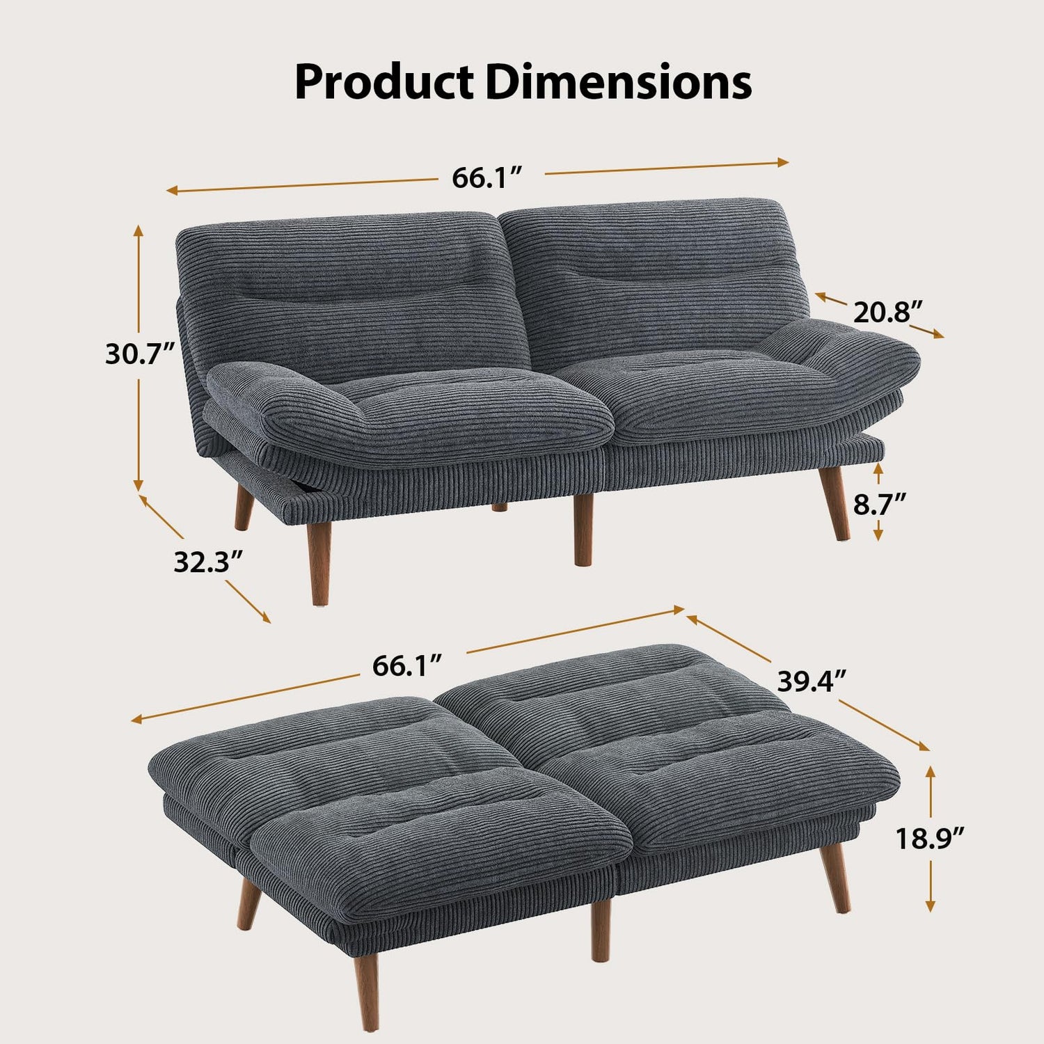 - Soft Corduroy Fabric: Covered in soft, durable fabric, this corduroy futon blends comfort with vintage style. The mid-century inspired design can add a timeless, vintage touch to any living space, elevating your home décor to the next level
